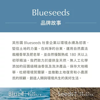Blueseeds 以友善土地的耕種方式孕育香草植物,使用自然農法栽種的薄荷、檸檬與茶樹精油調配而成,打造純淨沁涼的潔淨感受。無皂鹼、無人工香精,洗後肌膚清爽無負擔,彷彿沉浸於清晨綠野中。使用自然農法栽種初萃精油精露精心慢製,融合茶樹、檸檬與薄荷的清新氣息,溫和洗去肌膚的油汗與黏膩,於日常沐浴之間,實踐對身體與土地的溫柔承諾。