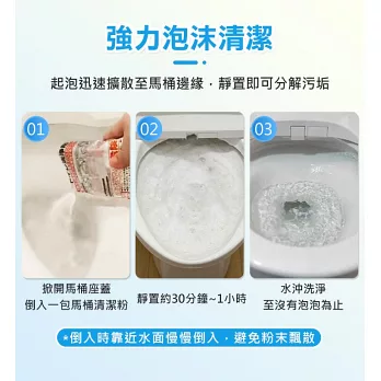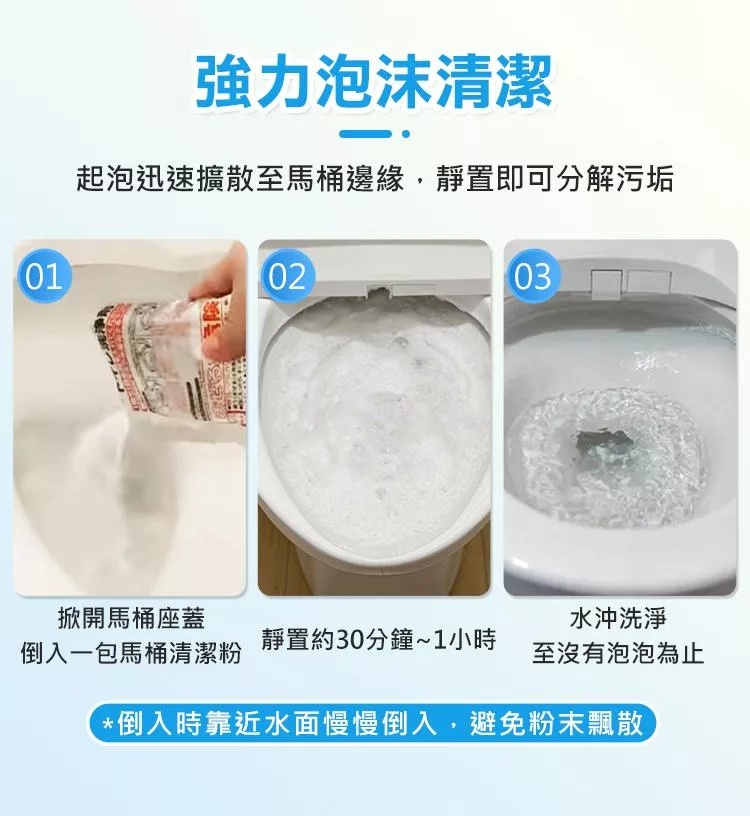 將一包倒入馬桶,請由低處倒入避免粉末飛濺,請立即擦掉。