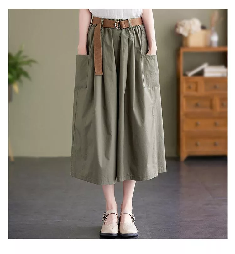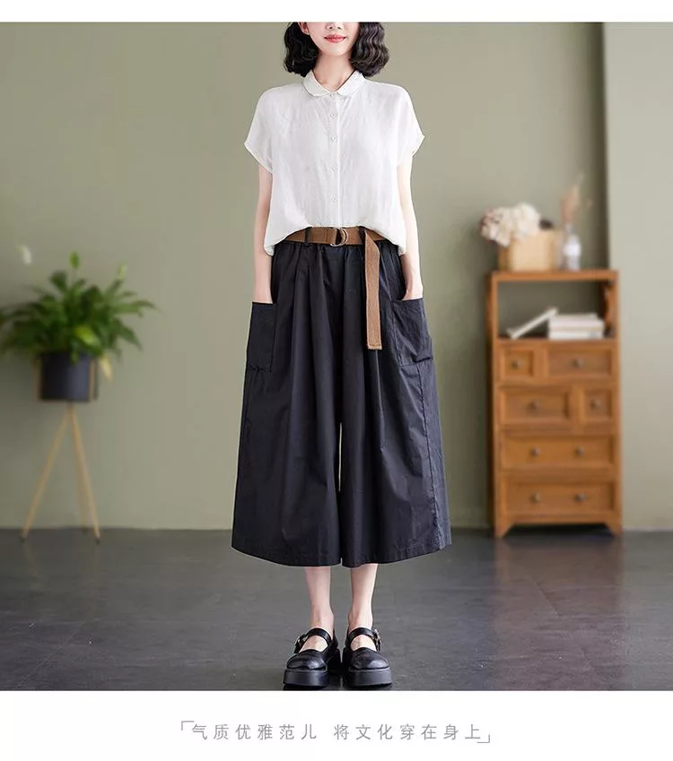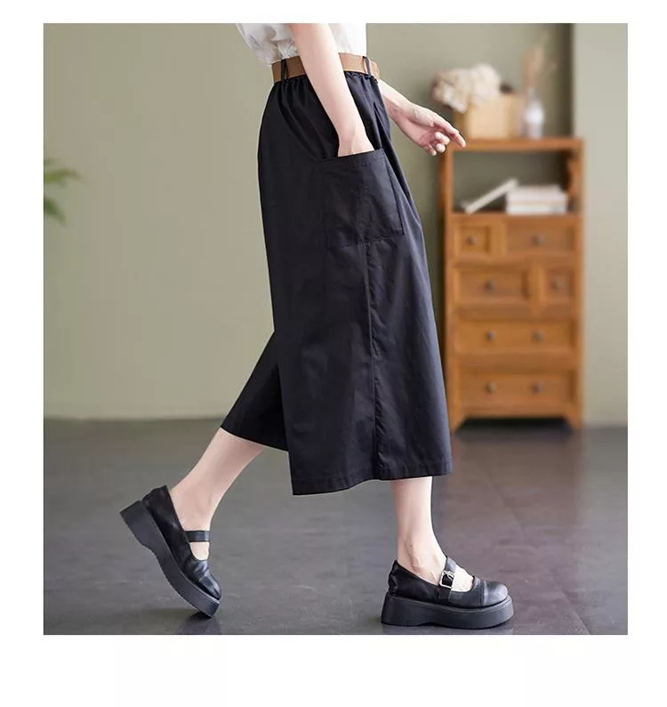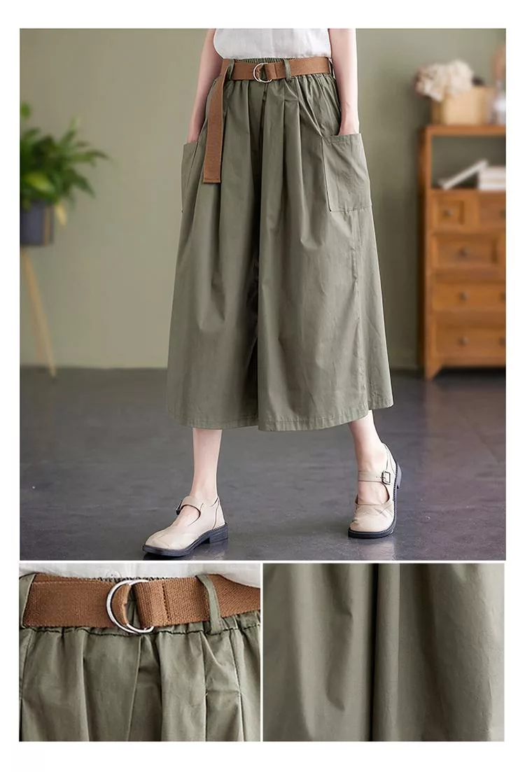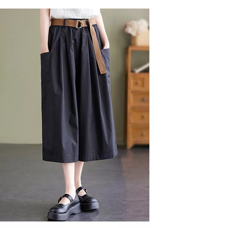 【慢。生活】鬆緊腰附腰帶顯瘦七分闊腿褲 8268  FREE 黑色