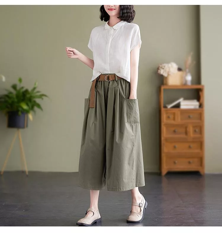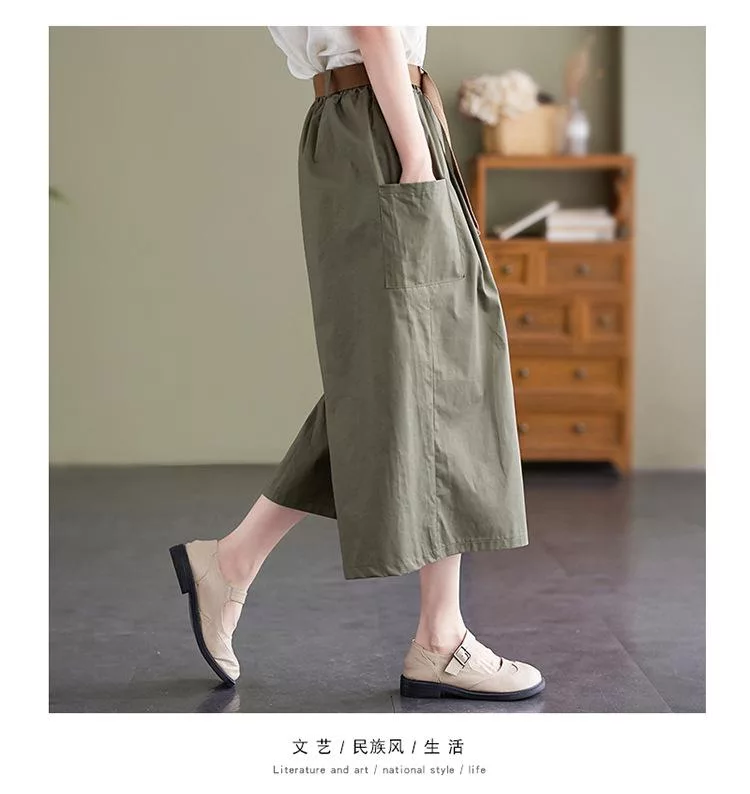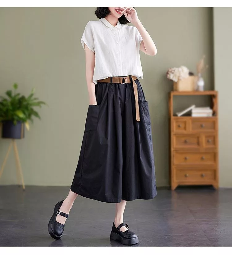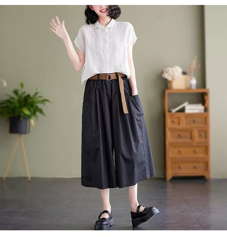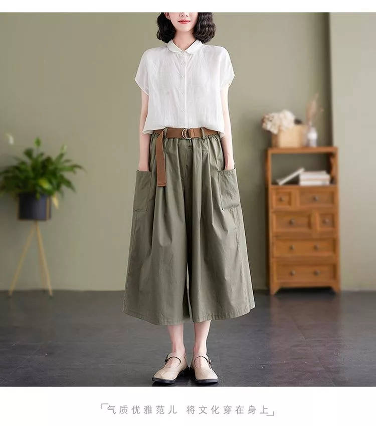 【慢。生活】鬆緊腰附腰帶顯瘦七分闊腿褲 8268  FREE 黑色