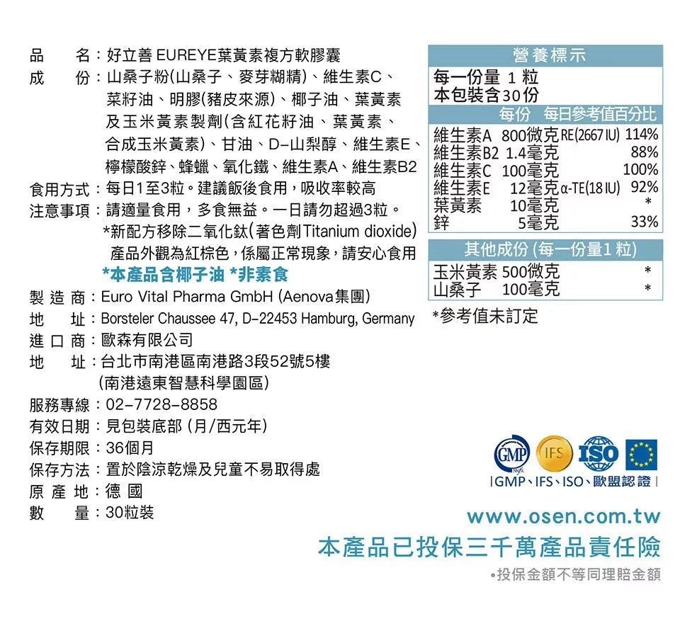 德國 好立善 EUREYE葉黃素全方位複方軟膠囊(30粒)