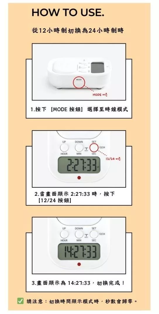 4. 設定完成後,可按【12/24】按鈕在 AM/PM 與 24 小時制間切換