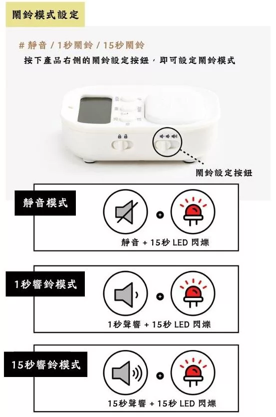 - 根據設定(靜音、1秒、15秒)鬧鈴響起,LED 燈會閃爍約 15 秒