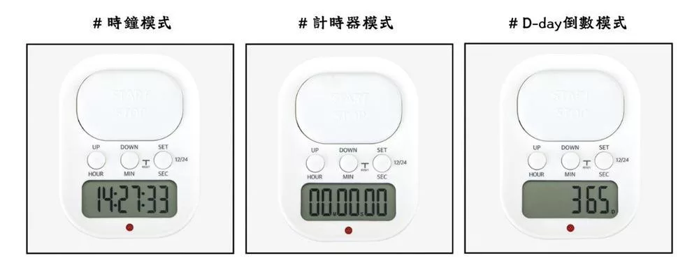 按下左側的 MODE 按鈕, 可切換至時鐘、計時器、D-Day 等模式使用。