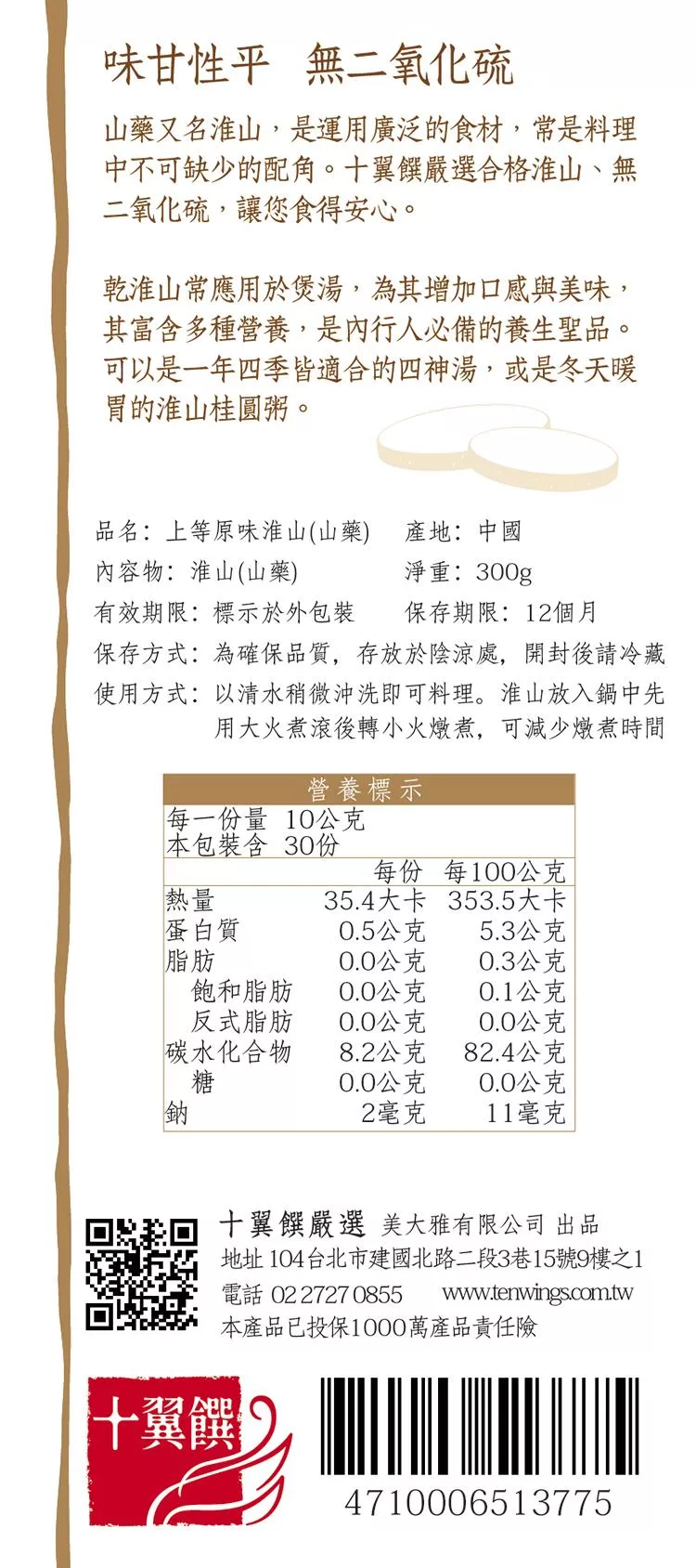 【十翼饌】上等原味淮山/山藥300g(無二氧化硫/乾淮山/煲湯食材/四神湯材料)