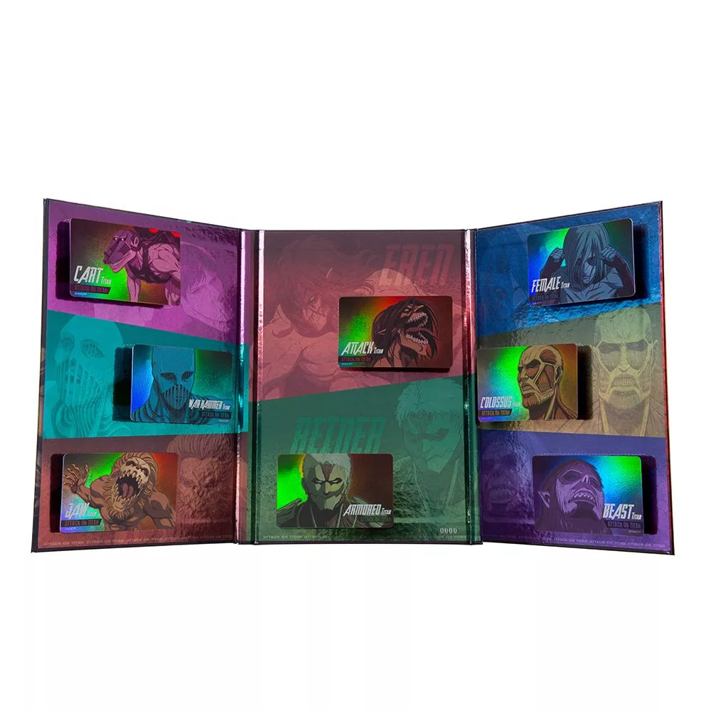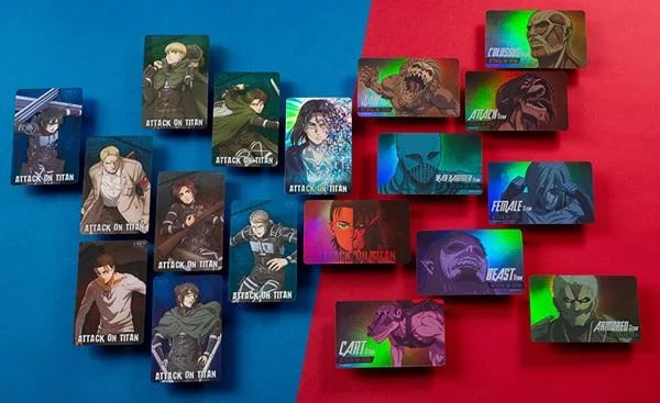 「巨人套組」則收錄了8張經典角色的閃卡悠遊卡,每一張都充滿魄力!同樣附贈書型收納盒,讓你的收藏瞬間升級。最最最重要的是,還加送一張巨人艾連閃卡超級卡!這份震撼力,絕對是巨人粉的夢幻逸品!