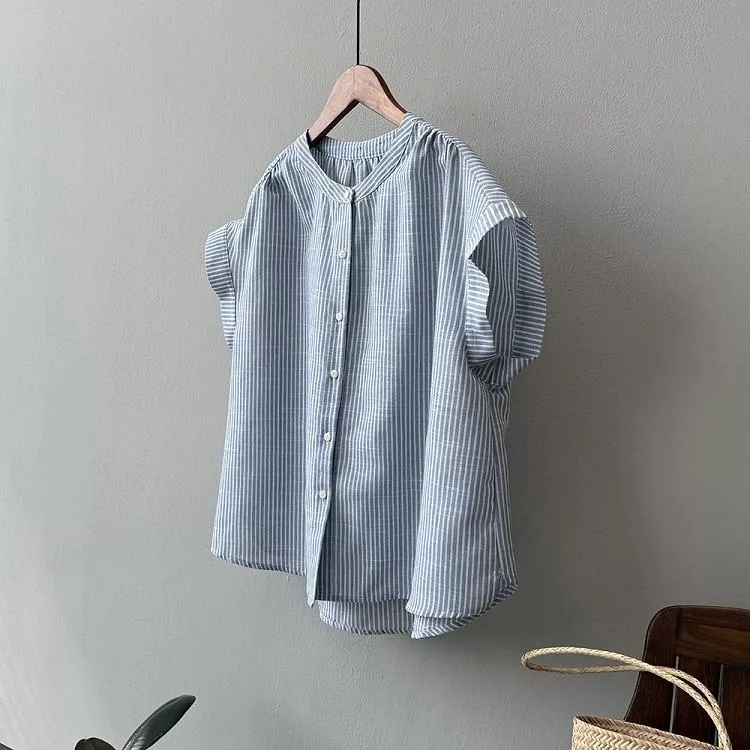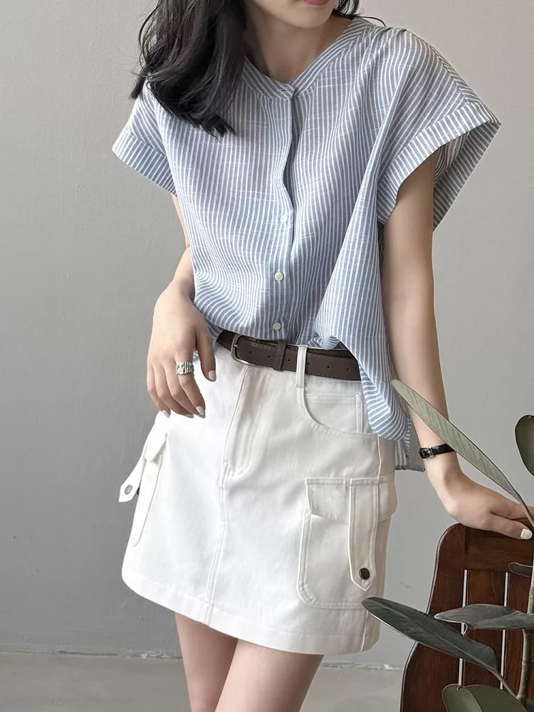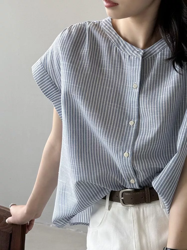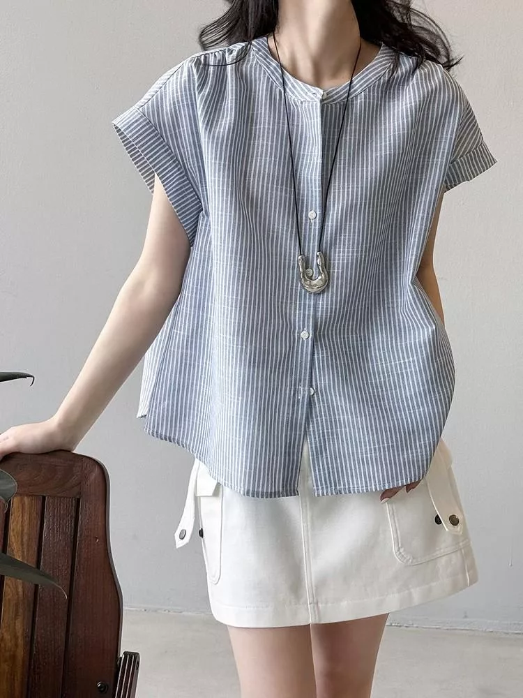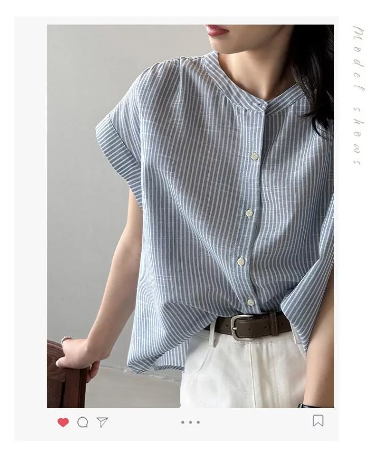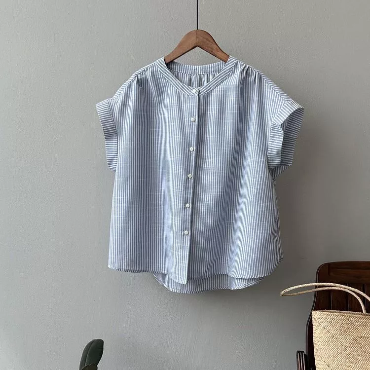 【Jilli~ko】法式條紋圓領溫柔風短袖襯衫 9805 FREE 藍色