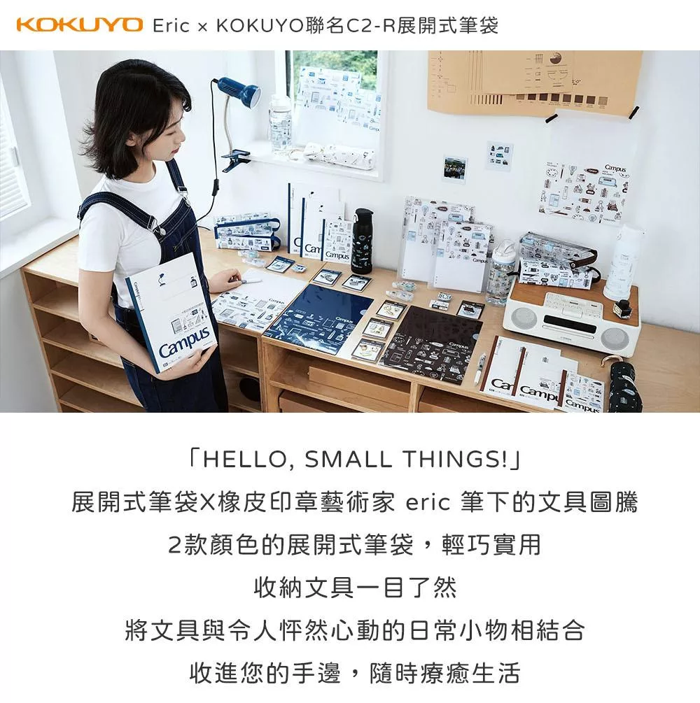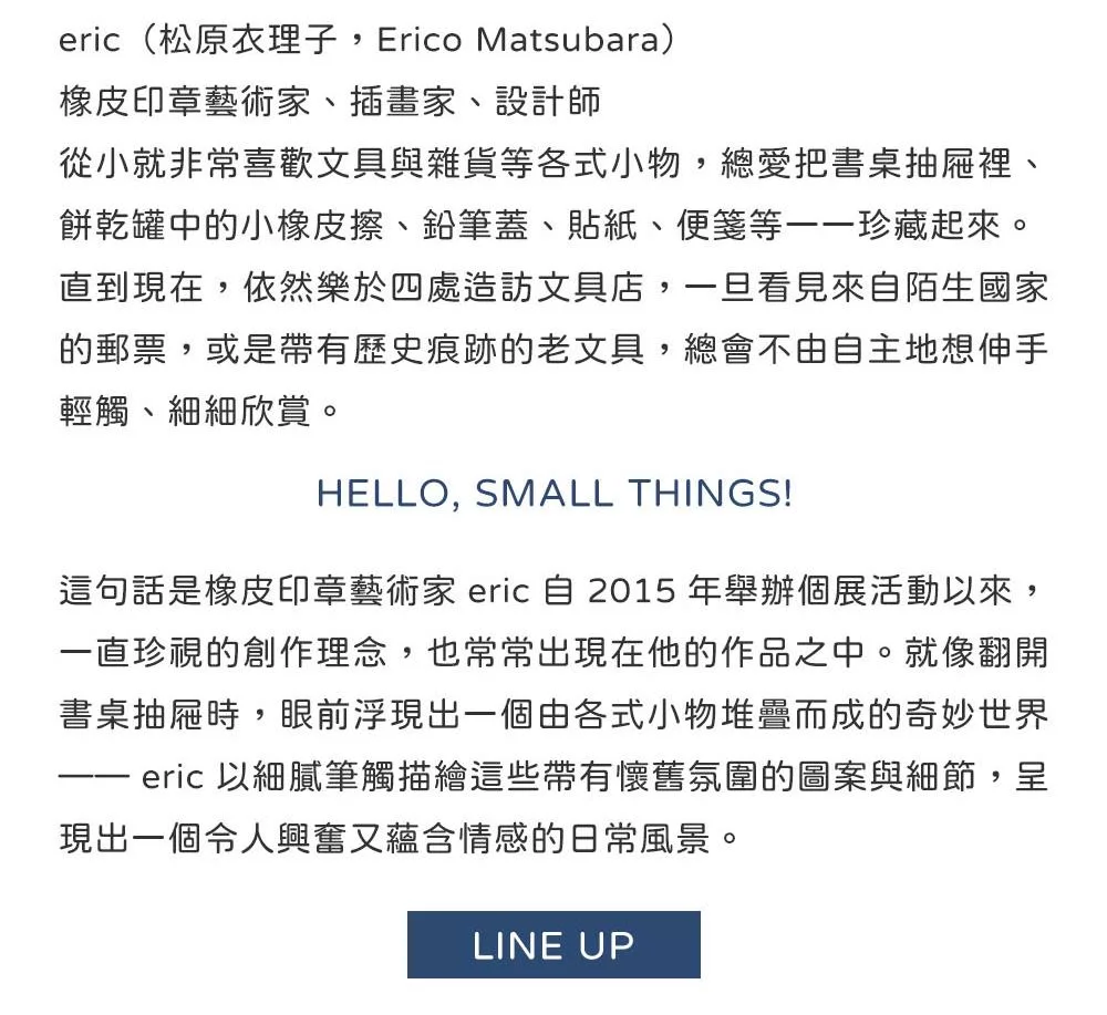 橡皮印章作家、插畫師、設計師。喜歡收藏文具與雜貨的小物世界,將書桌抽屜裡的靈感化為圖像語言。自創作理念「HELLO, SMALL THINGS!」誕生以來,Eric持續描繪著那份細膩、懷舊又充滿童趣的日常微光——那些看似微小,卻藏著生活裡最美好的情緒。