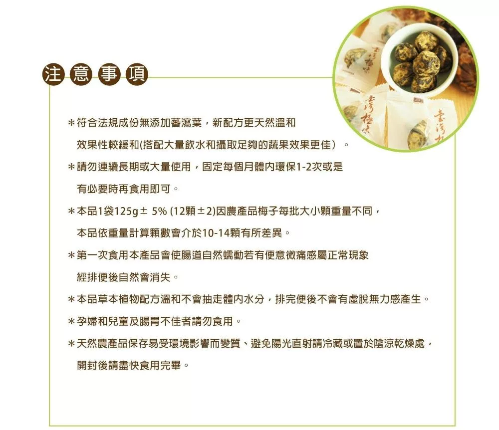 *本品1袋125g± 5% (約10顆)因農產品梅子每批大小顆重量不同,本品依重量計算顆數會介於10顆上下有所差異