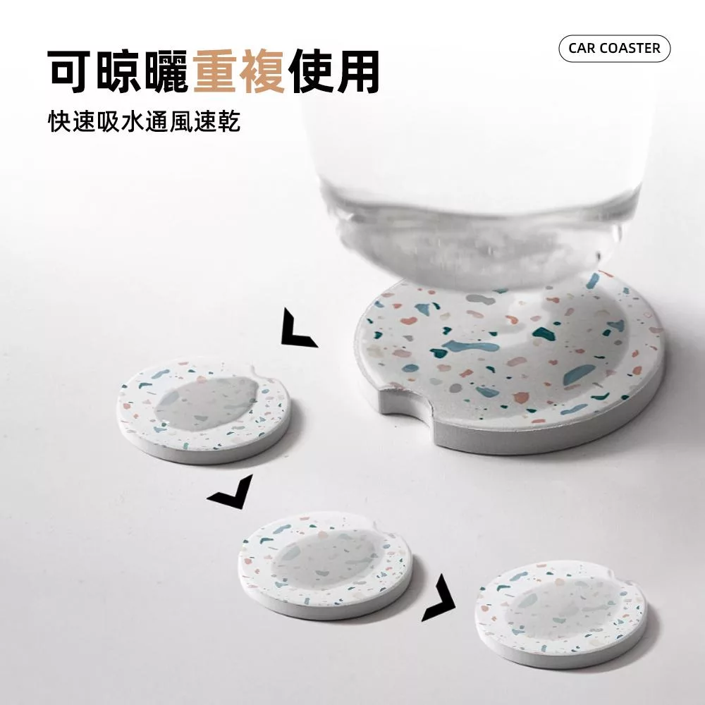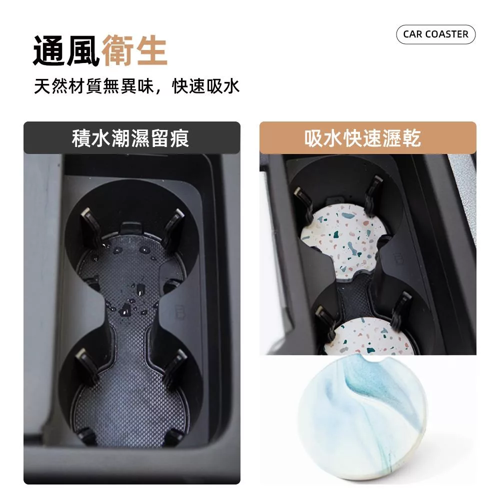 選用天然珪藻土製成,表面微孔可瞬間吸收飲料杯底凝結水珠,防止杯架內積水與異味。直徑 6.5cm 符合多數汽車杯架底部尺寸,並設有缺口方便拆卸清洗。兩片同色組合,讓車內風格一致,隨時保持整潔與乾爽。