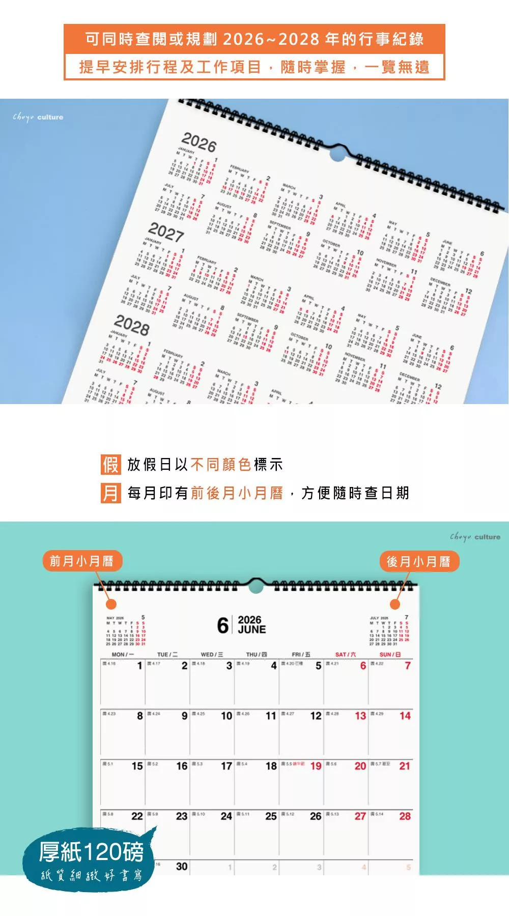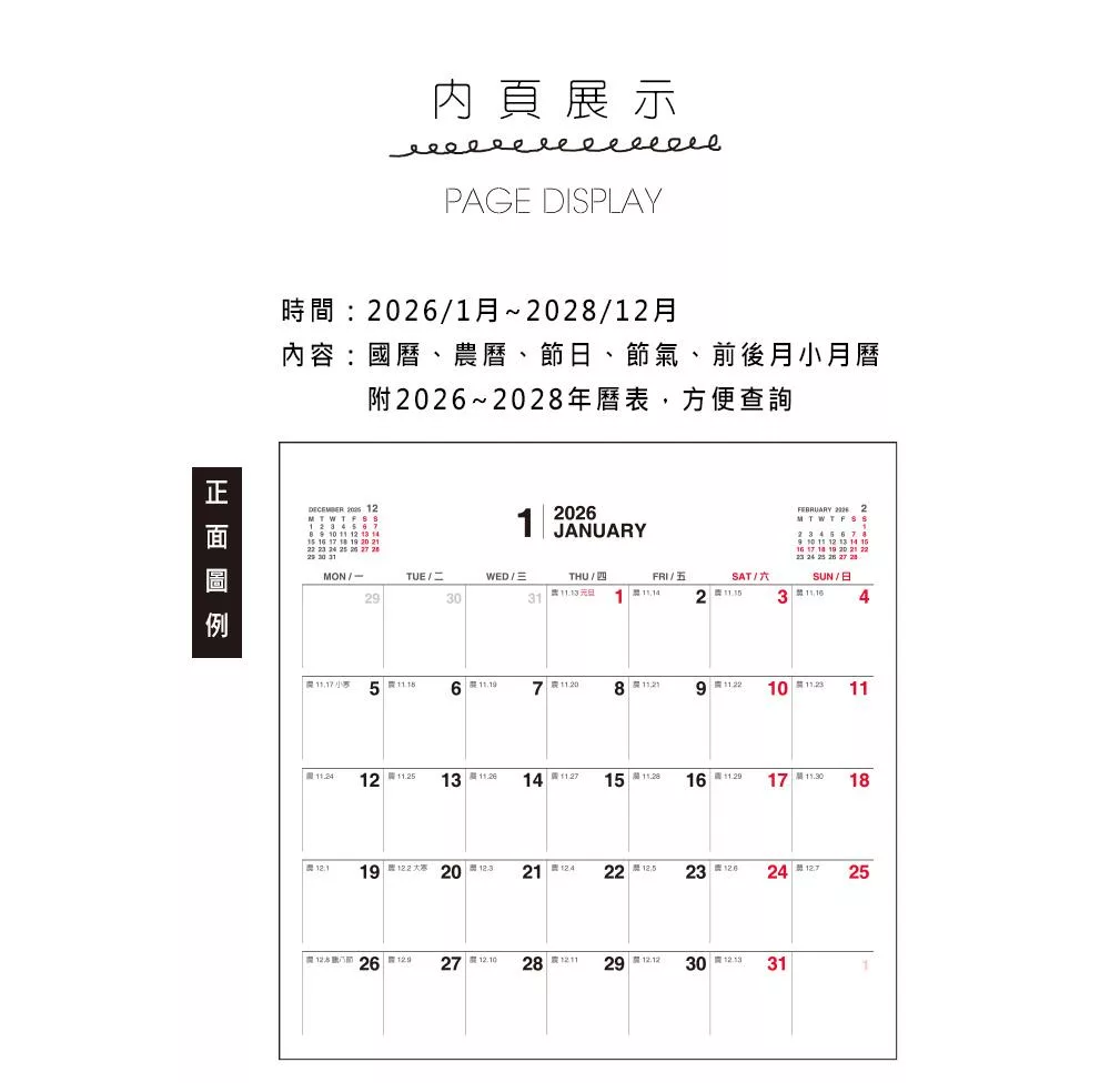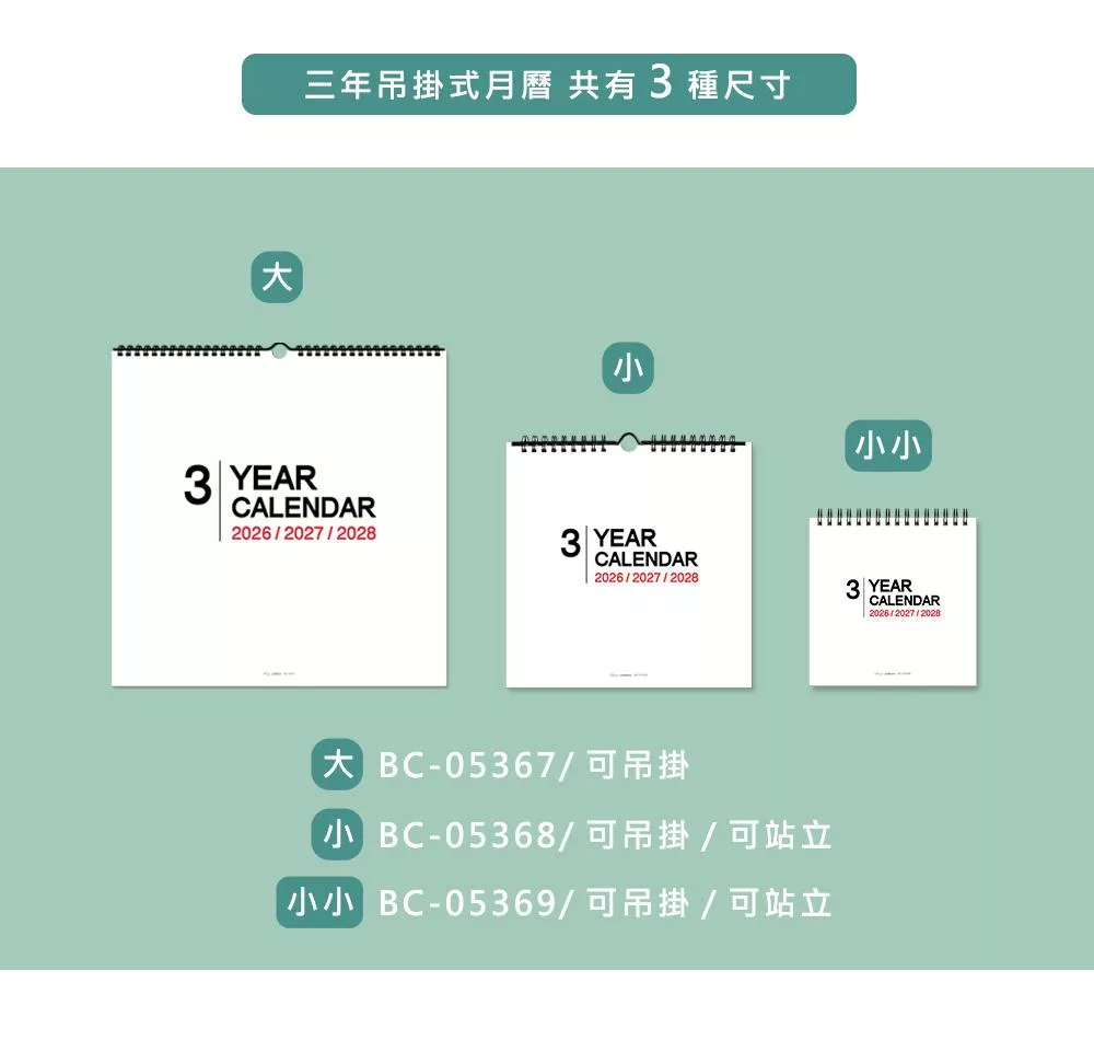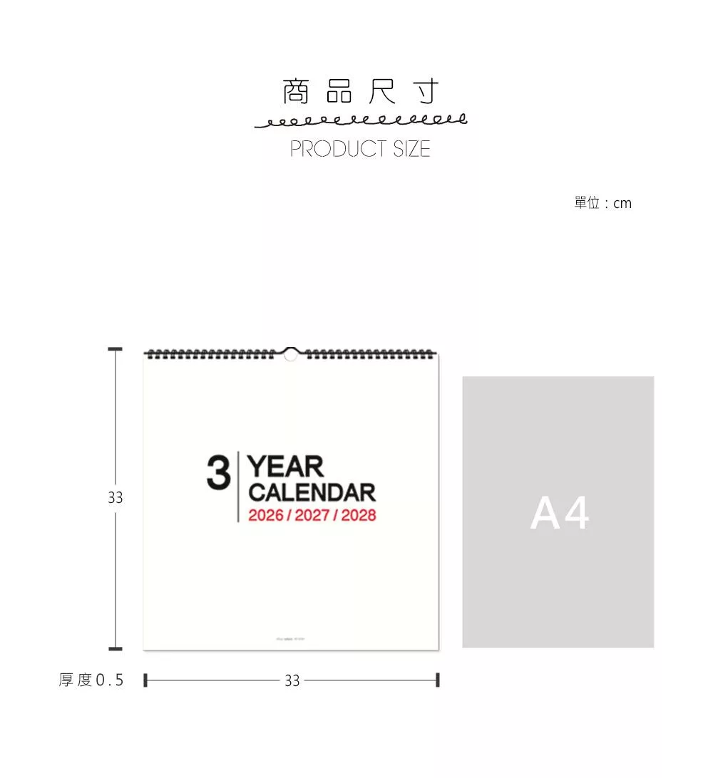 珠友 2026~2028年3年式吊掛式月曆/行事曆/長期規劃/掛曆/記事日曆/簡約無印(素面/大)