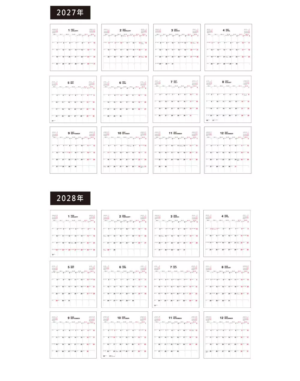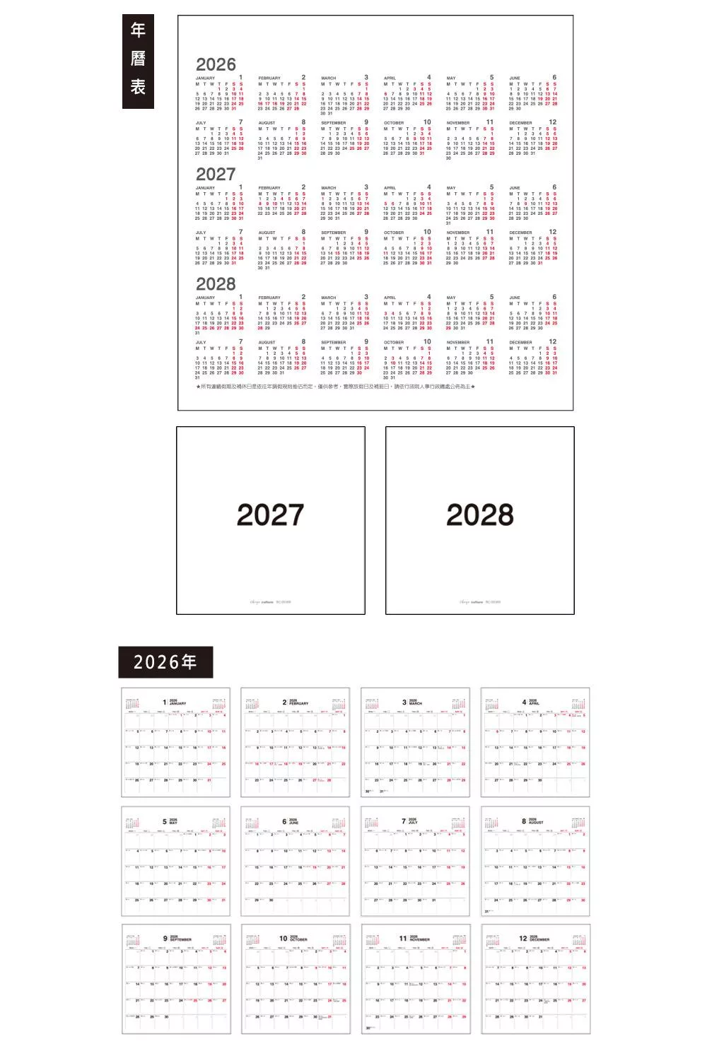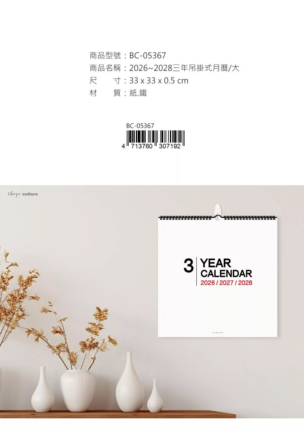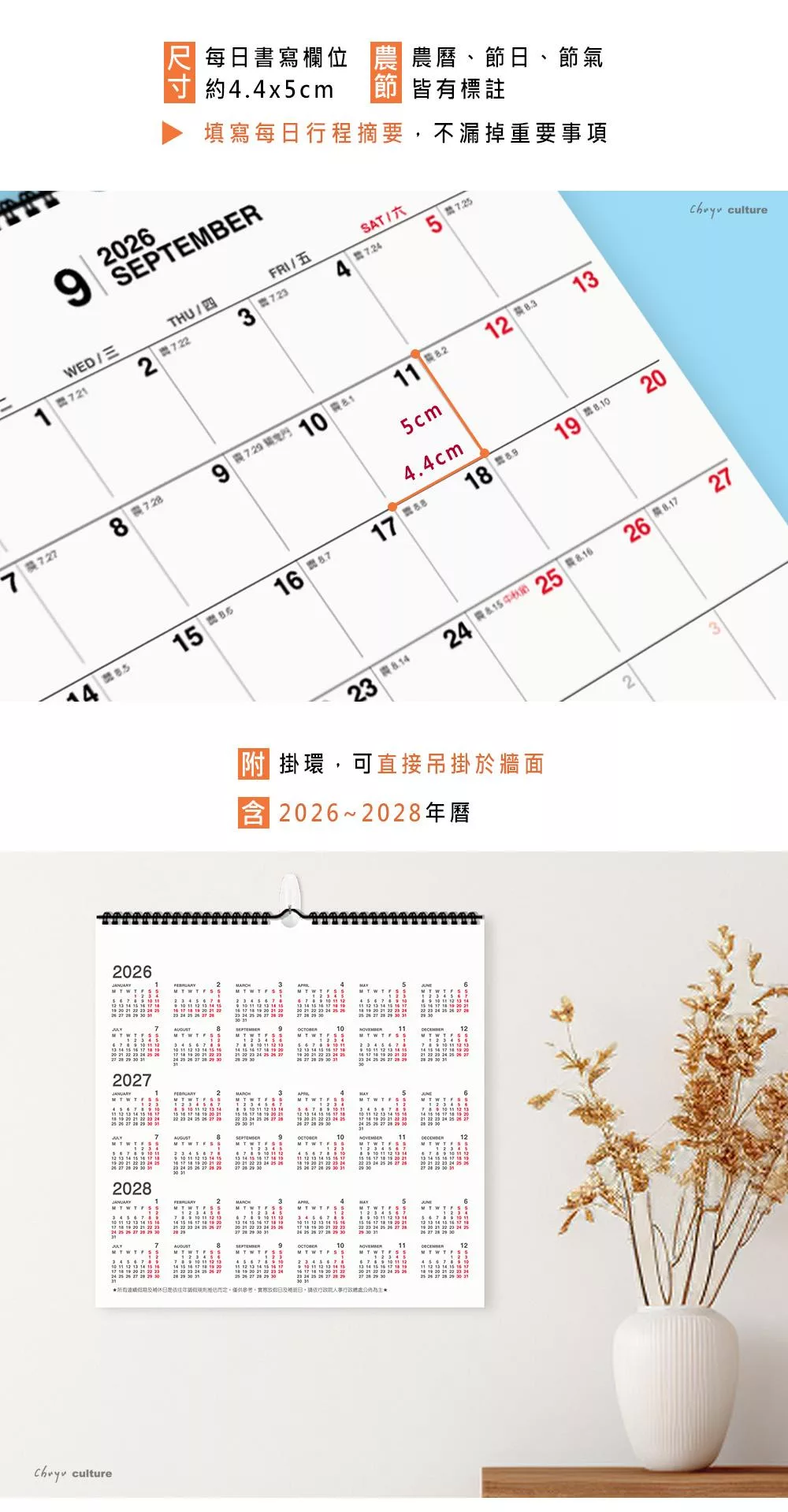 珠友 2026~2028年3年式吊掛式月曆/行事曆/長期規劃/掛曆/記事日曆/簡約無印(素面/大)