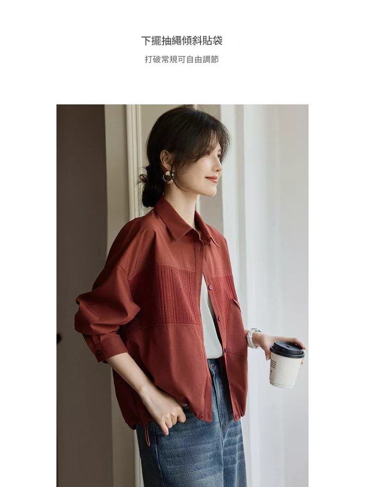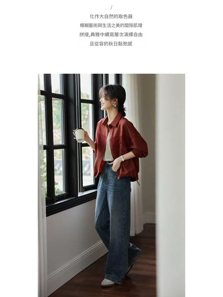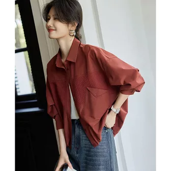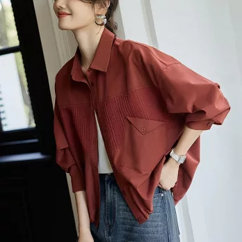 安可拉紅色肌理拼接抽繩襯衫風衣長袖外套#