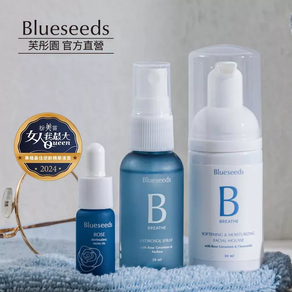 【Blueseeds 芙彤園】玫瑰煥顏隨身保養組 旅行組 (保濕潔顏慕斯30ml+保濕精露噴霧30ml+玫瑰精油露5ml)