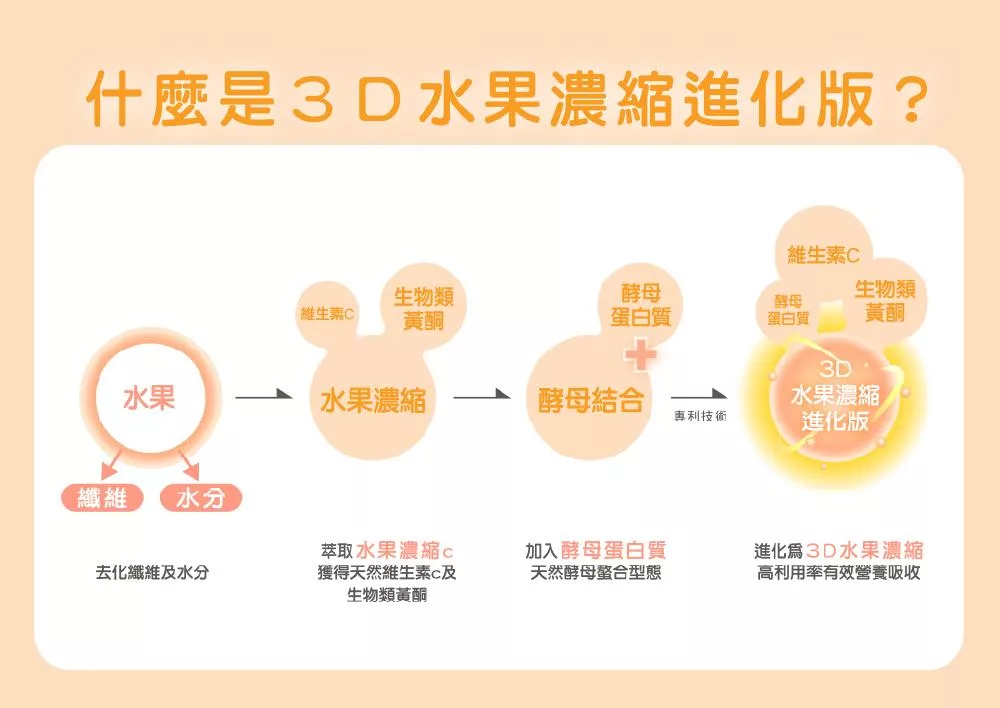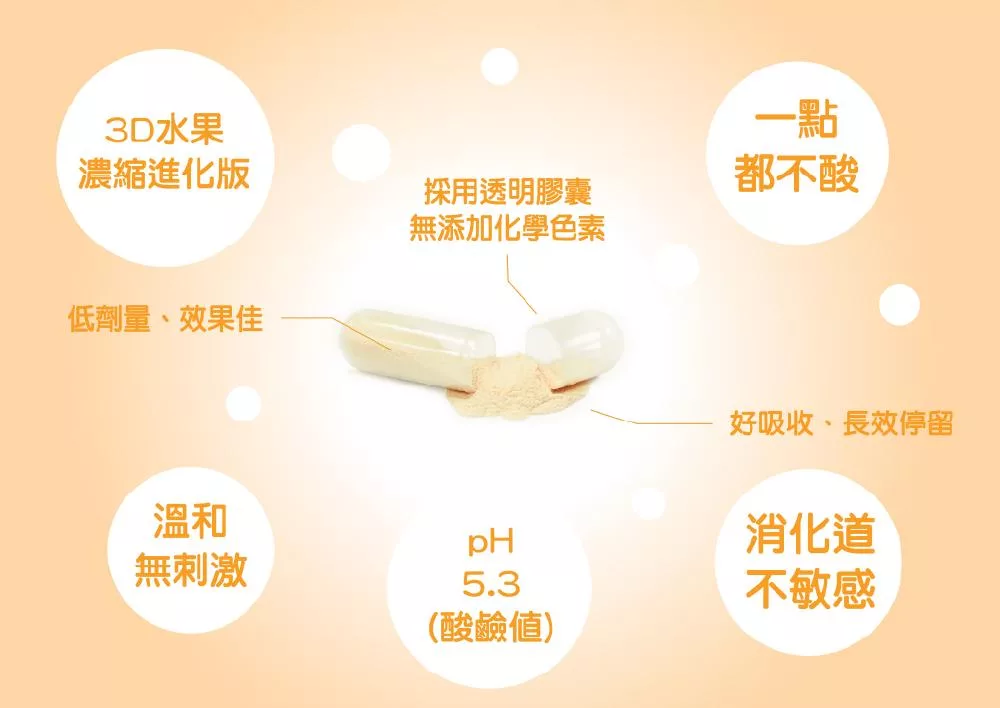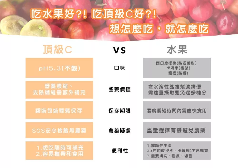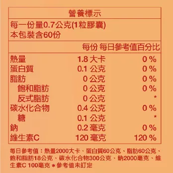 成 分:甜橙濃縮、卡姆果萃取物(卡姆果萃取物、麥芽糊精)、西印度櫻桃萃取物(麥芽糊精、西印度櫻桃萃取物)、二氧化矽