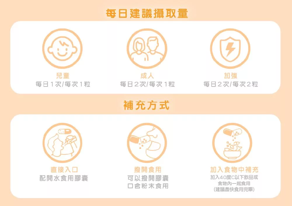 建議用法:每日1-3顆。可以剝開膠囊口含粉末食用或搭配開水時用膠囊。