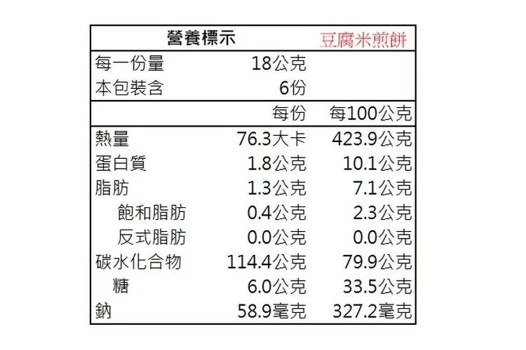 • 【內容物成份】麵粉、蔗糖、國產鹽滷豆腐(水、100%國產非基因改造黃豆、鹽滷(海水濃縮礦物質液-氯化鎂、硫酸鈣、氯化鈣及氯化鈉)、雞蛋、米穀粉(池農米、小麥蛋白)、奶粉、植物性酥油[棕櫚油、乳化劑(脂肪酸甘油脂) 、香料、抗氧化劑(維生素E) 、β胡蘿蔔素] 、奶油、食鹽