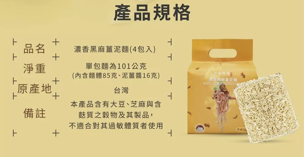 淨重:單包麵為101公克(內含麵體85克、泥薑醬16克),本包裝含4份