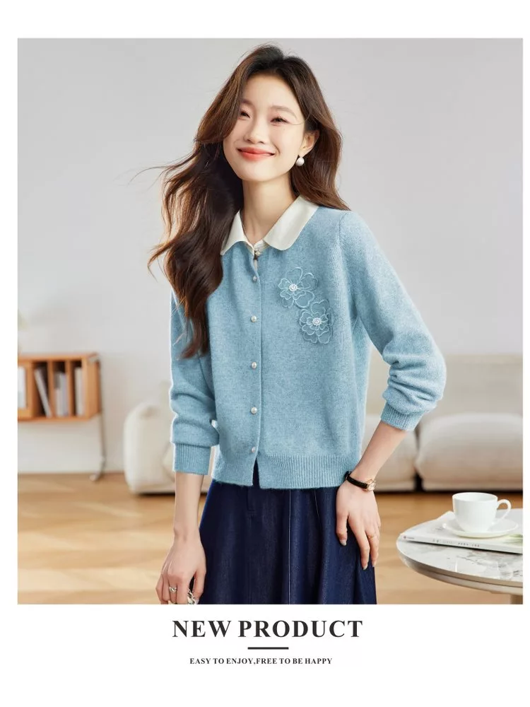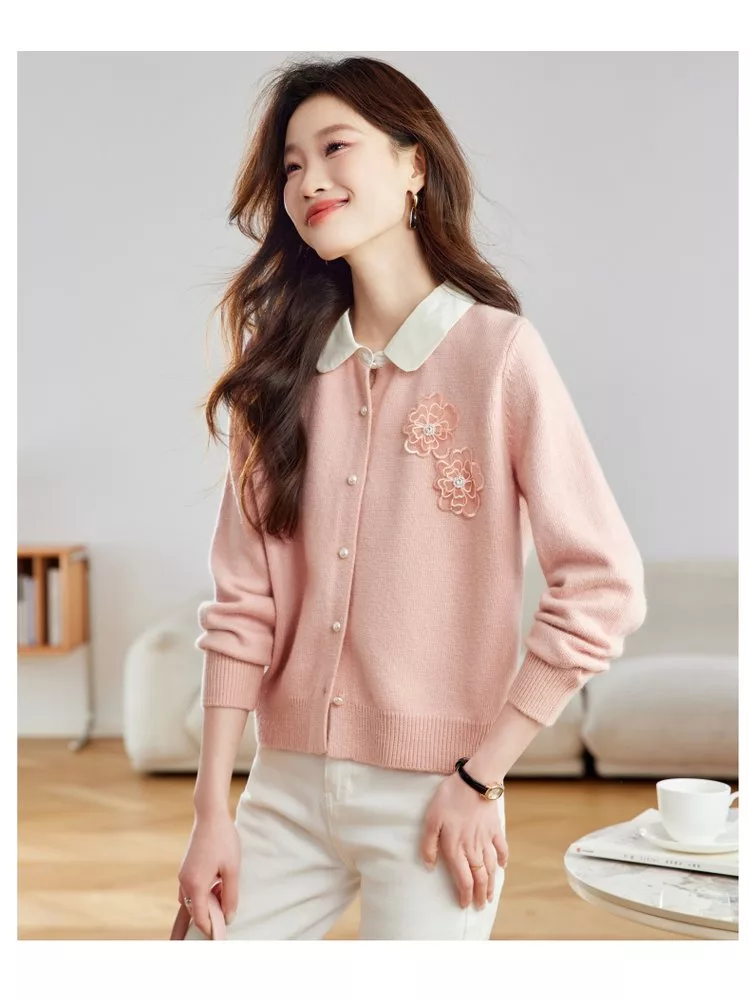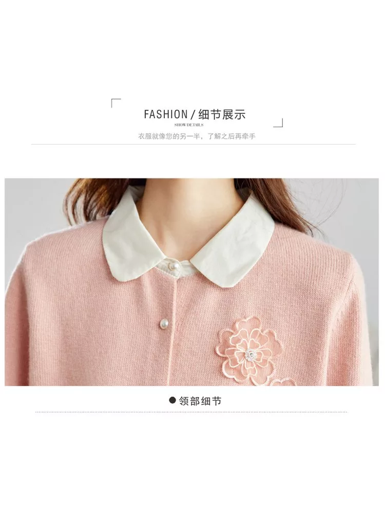 立體花朵拼色翻領針織短款毛衣外套#