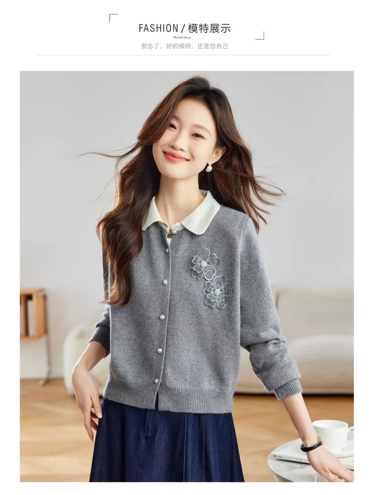 【MsMore】 立體花朵拼色翻領針織短款毛衣外套# 125545 FREE 灰色