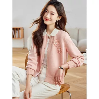 【MsMore】 立體花朵拼色翻領針織短款毛衣外套# 125545 FREE 玫紅色