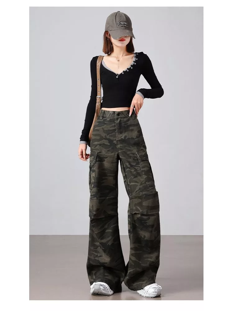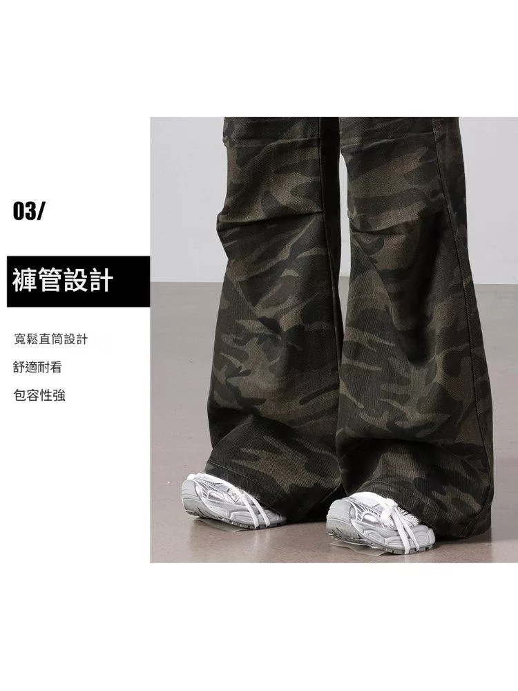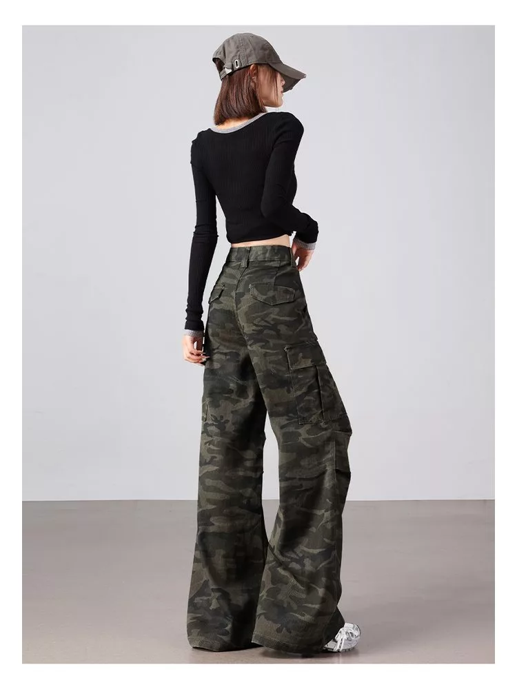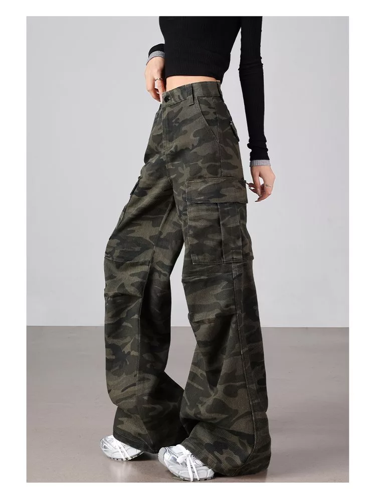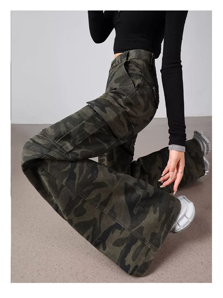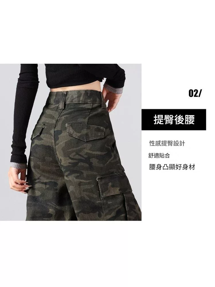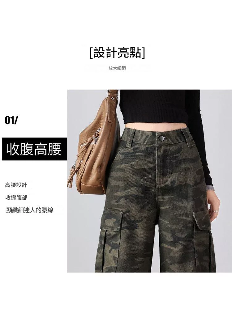 美式復古迷彩多口袋工裝微喇高腰寬鬆顯瘦闊腿褲#