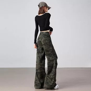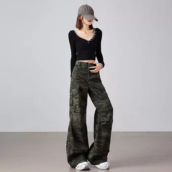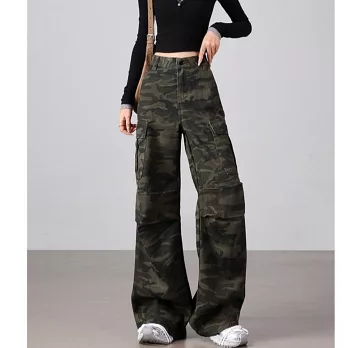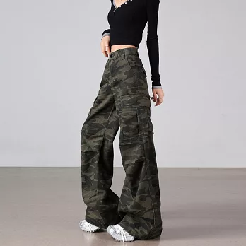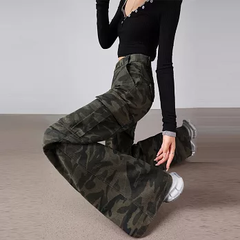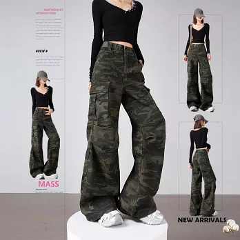 【MsMore】 美式復古迷彩多口袋工裝微喇高腰寬鬆顯瘦闊腿褲# 126236 S 綠色