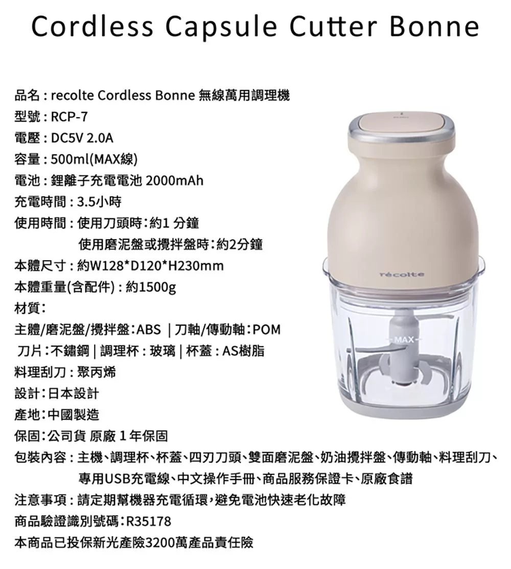 recolte 日本麗克特Cordless Bonne 無線萬用調理機 RCP-7 奶油白