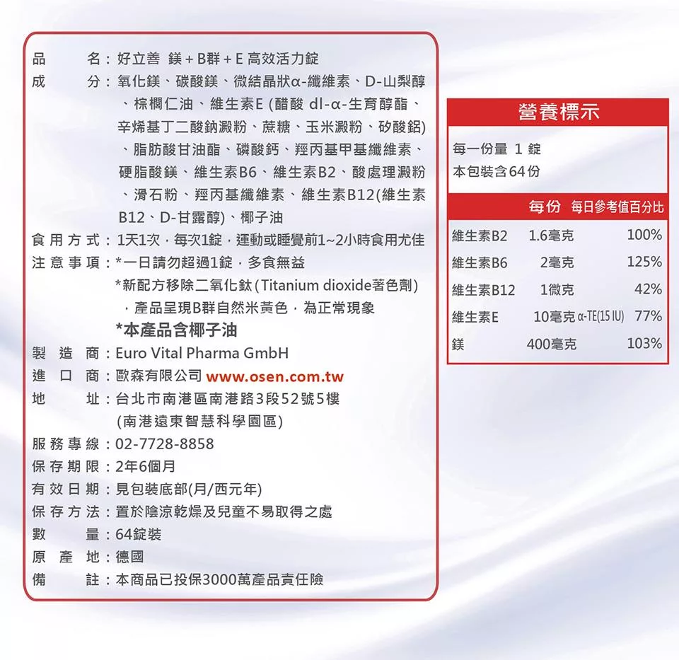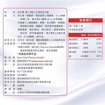 德國 好立善 鎂+B群+E 高效活力錠 (64粒/盒)