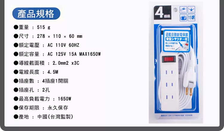 【Mayka明家】1開4插 附防塵蓋 延長線 4.5M 15呎 (SP-422-15)