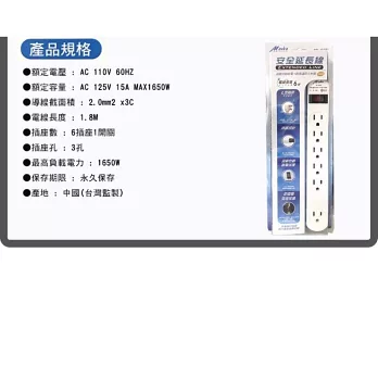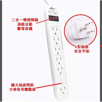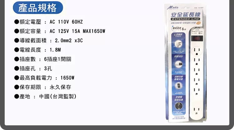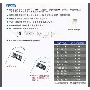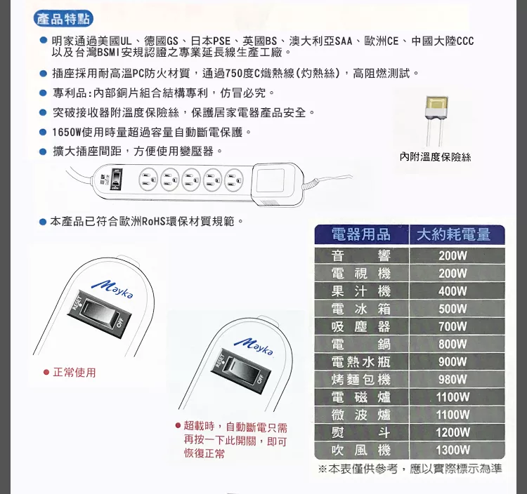 過載自動斷電保護 防雷擊突波保護 特殊設計擴大尾端插座間距 採用耐高溫PC防火材質 符合歐洲RoHS環保材質規範