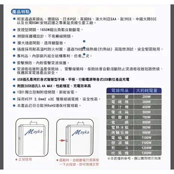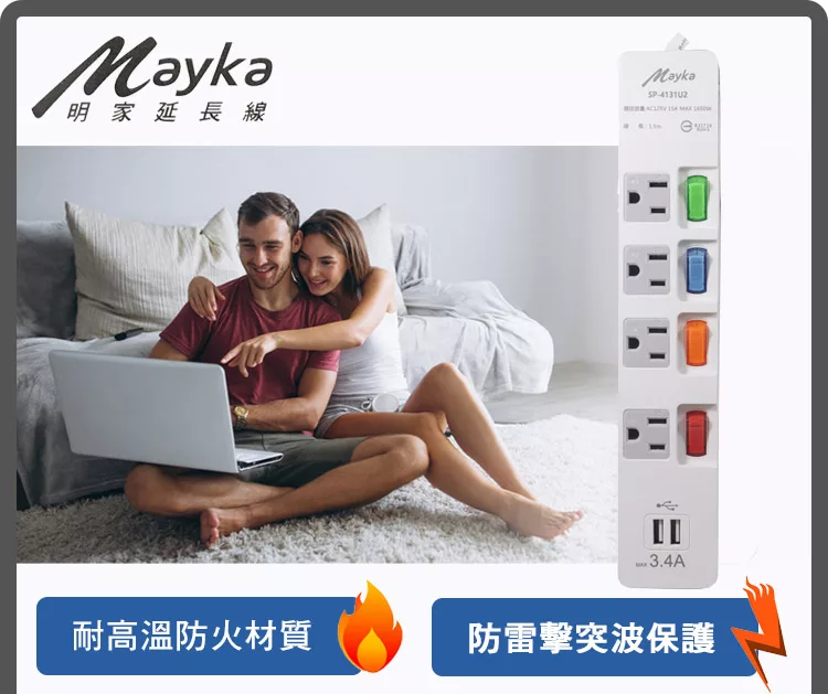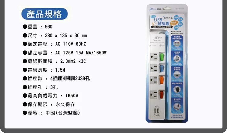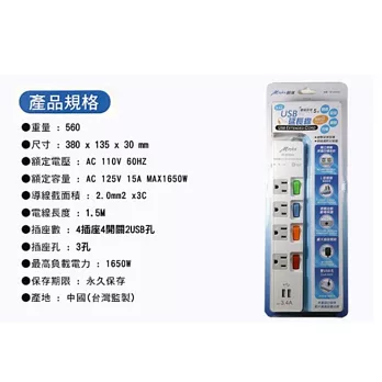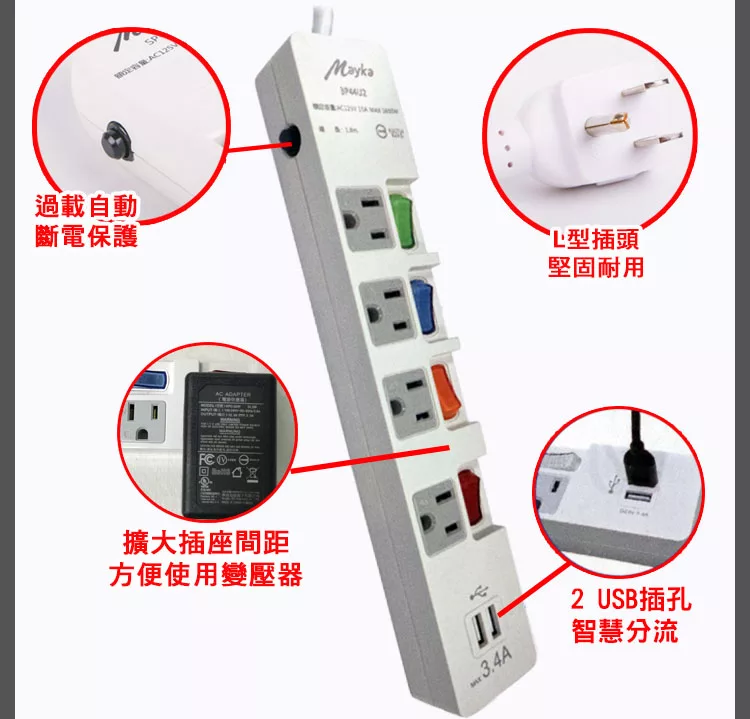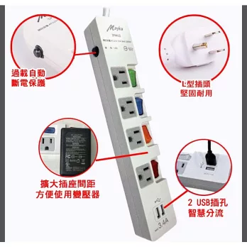 aibo 淨.極簡 3孔4插 USB延長線-1.8米
