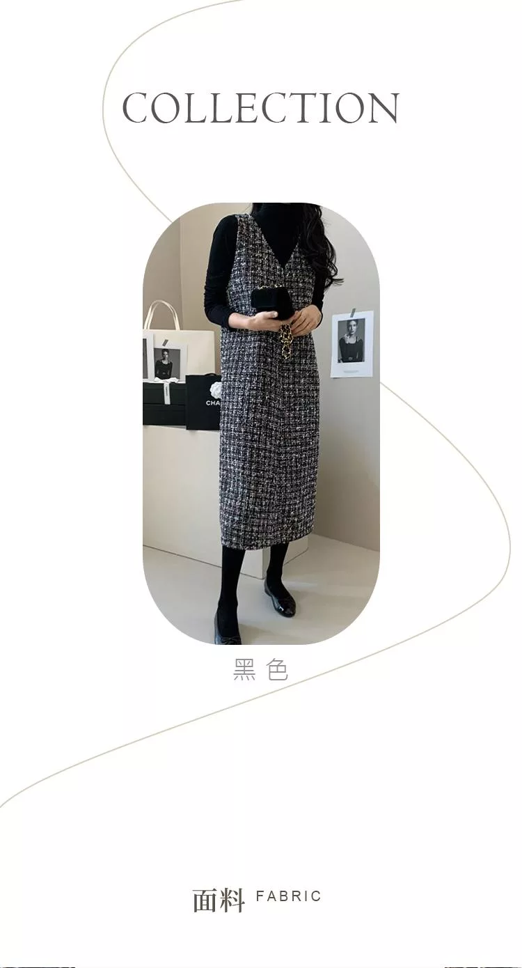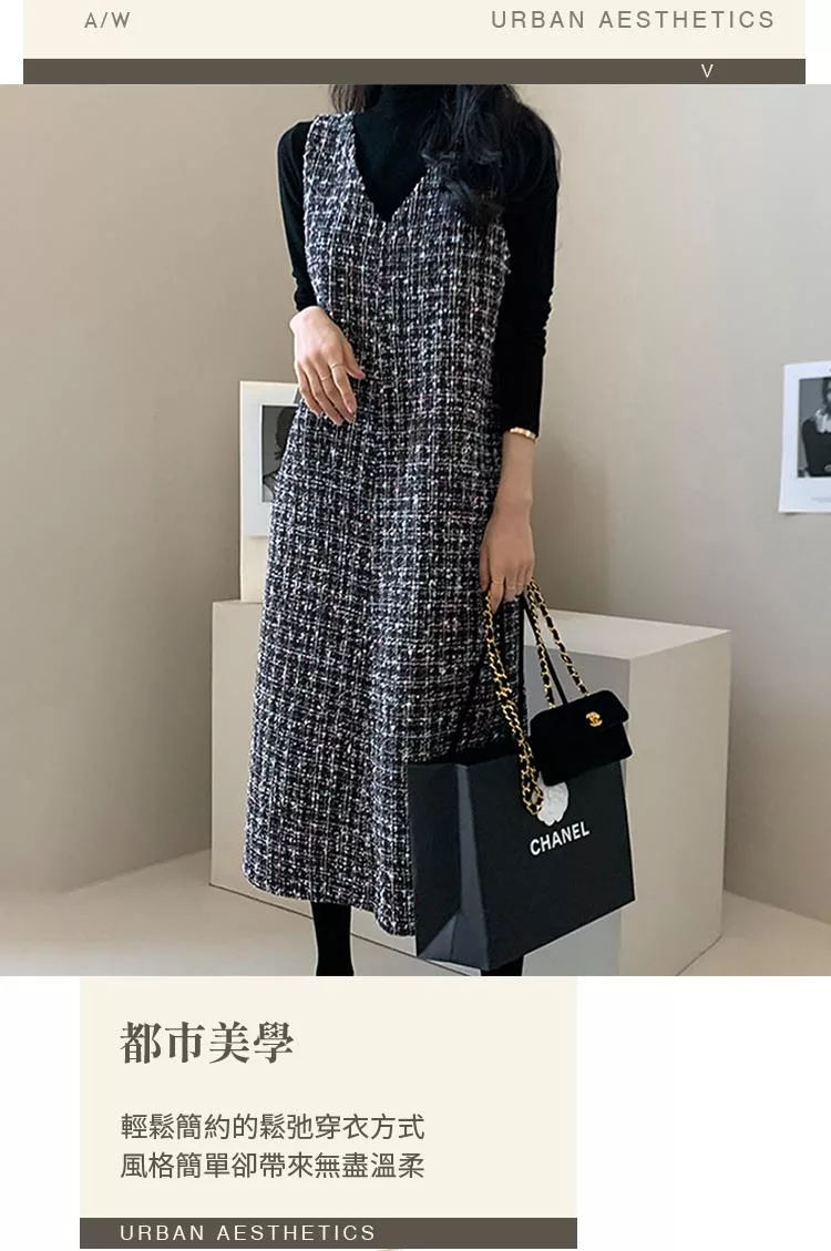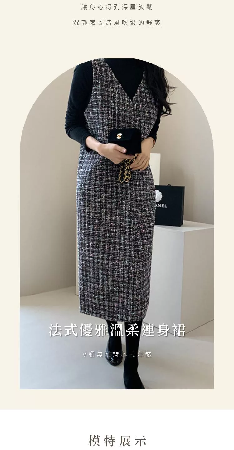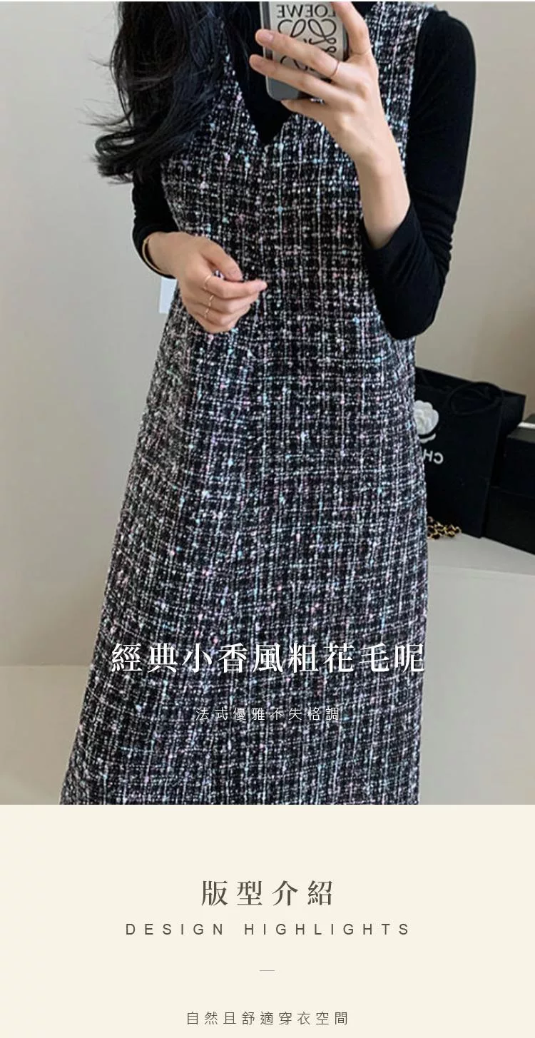 【初色】輕奢小香風粗花毛呢V領無袖修身顯瘦背心裙中長裙連衣裙連身洋裝長裙-黑色-16117(F可選) F 黑色