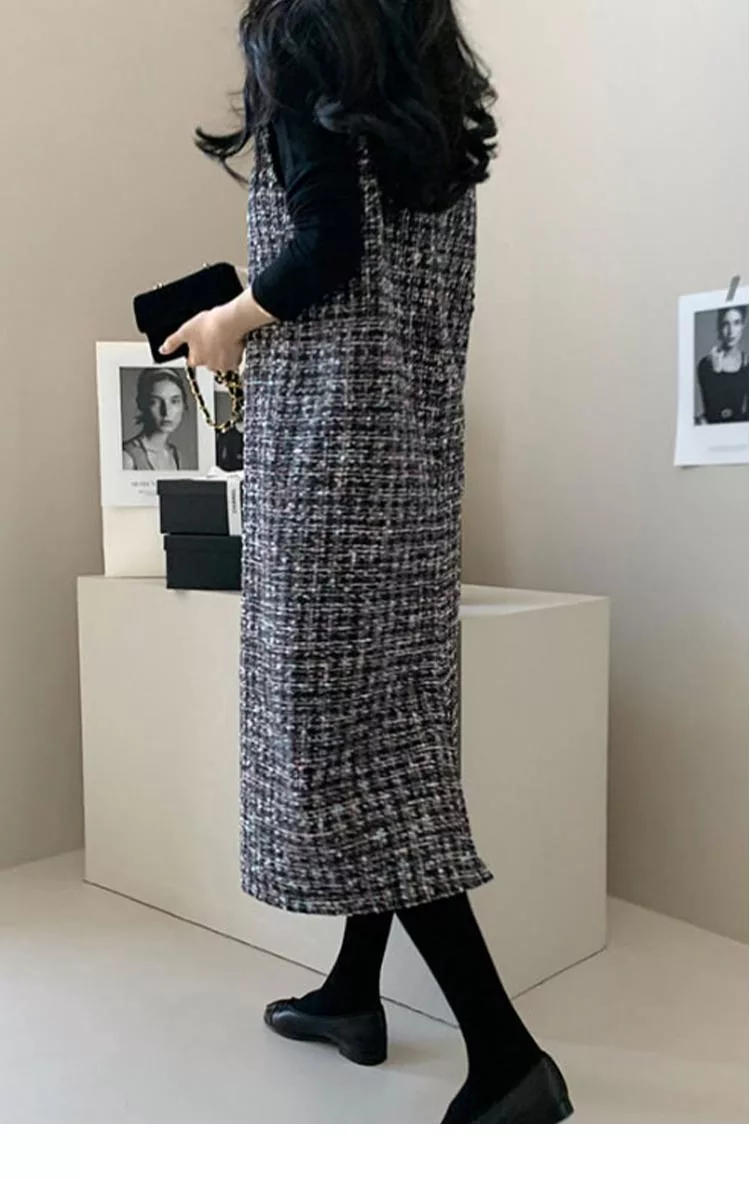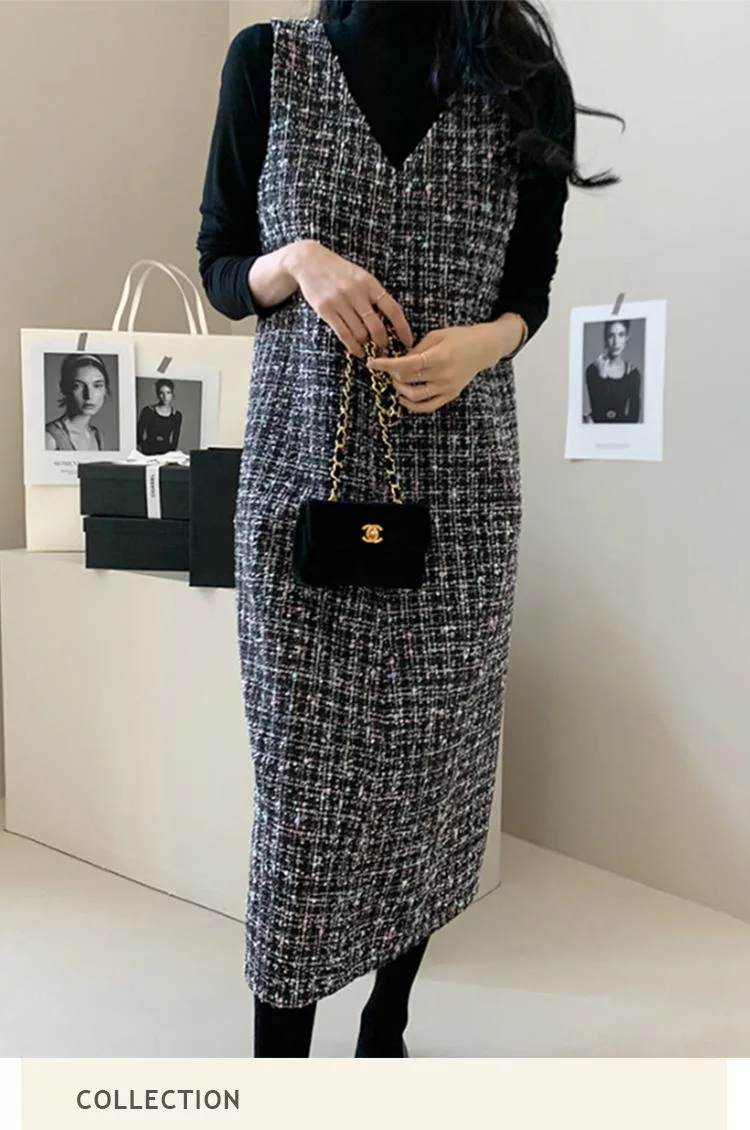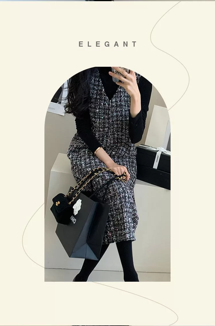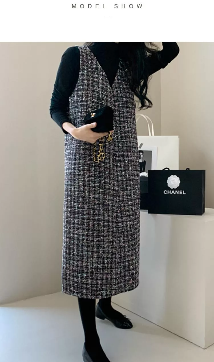 【初色】輕奢小香風粗花毛呢V領無袖修身顯瘦背心裙中長裙連衣裙連身洋裝長裙-黑色-16117(F可選) F 黑色