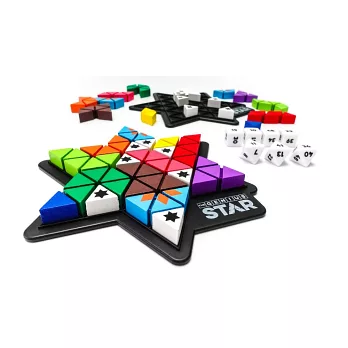 在48個三角形組成的六芒星版圖上,11種積木與7根「柱樁」能變化出165,888種組合。