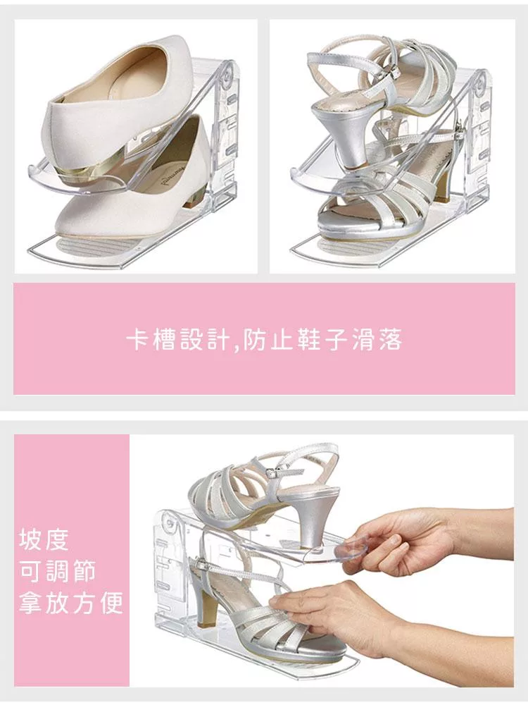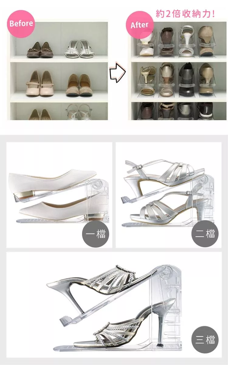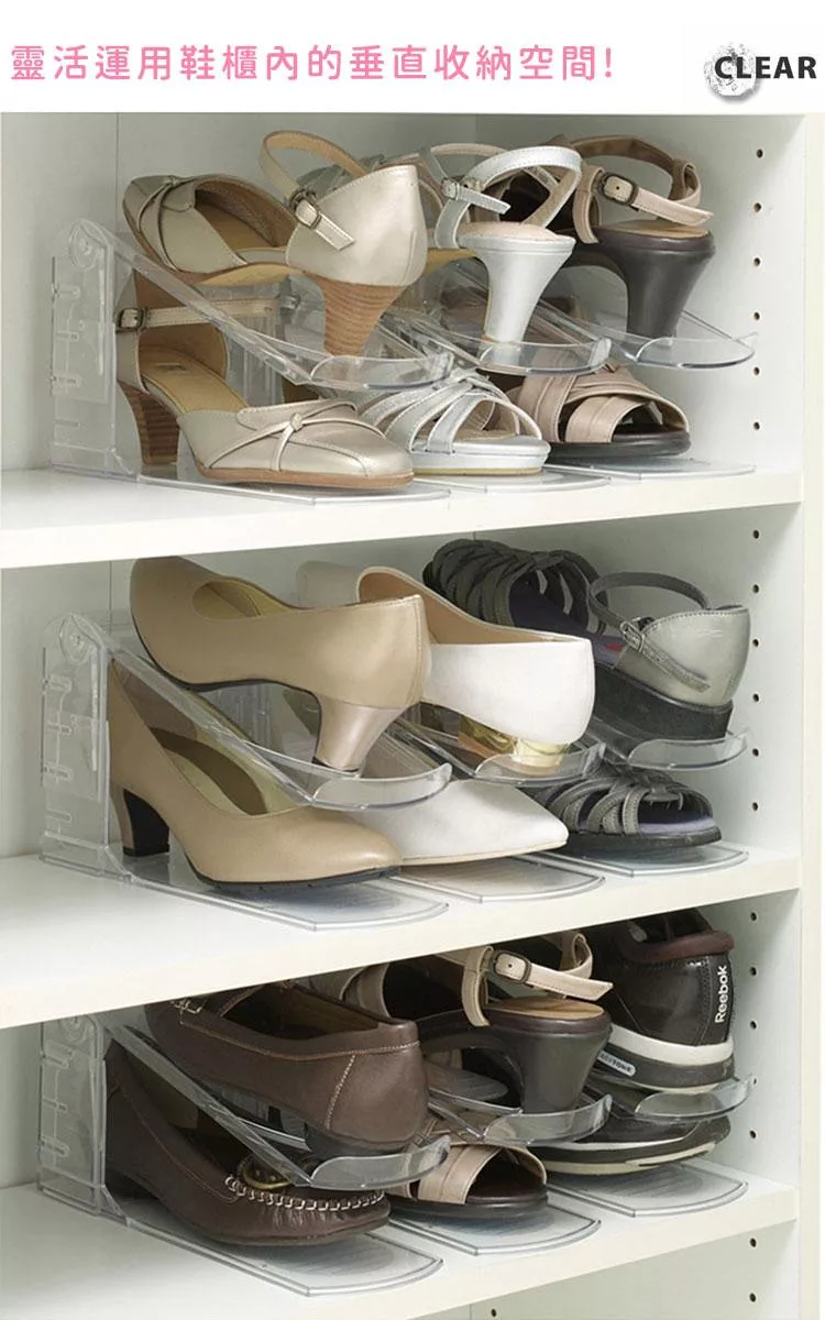 採用透明材質製成,可一目了然鞋款位置,方便拿取。結構穩固、堆疊性佳,可自由組合使用,依空間與鞋量調整層數。適用於玄關、鞋櫃或衣櫥收納,讓鞋子擺放更整齊。