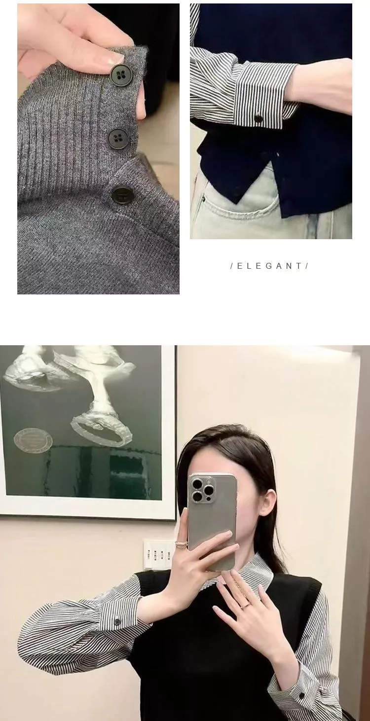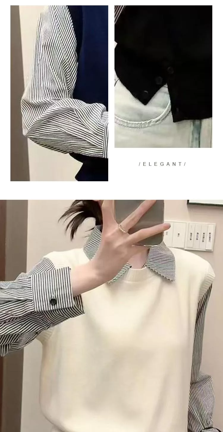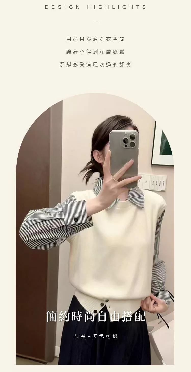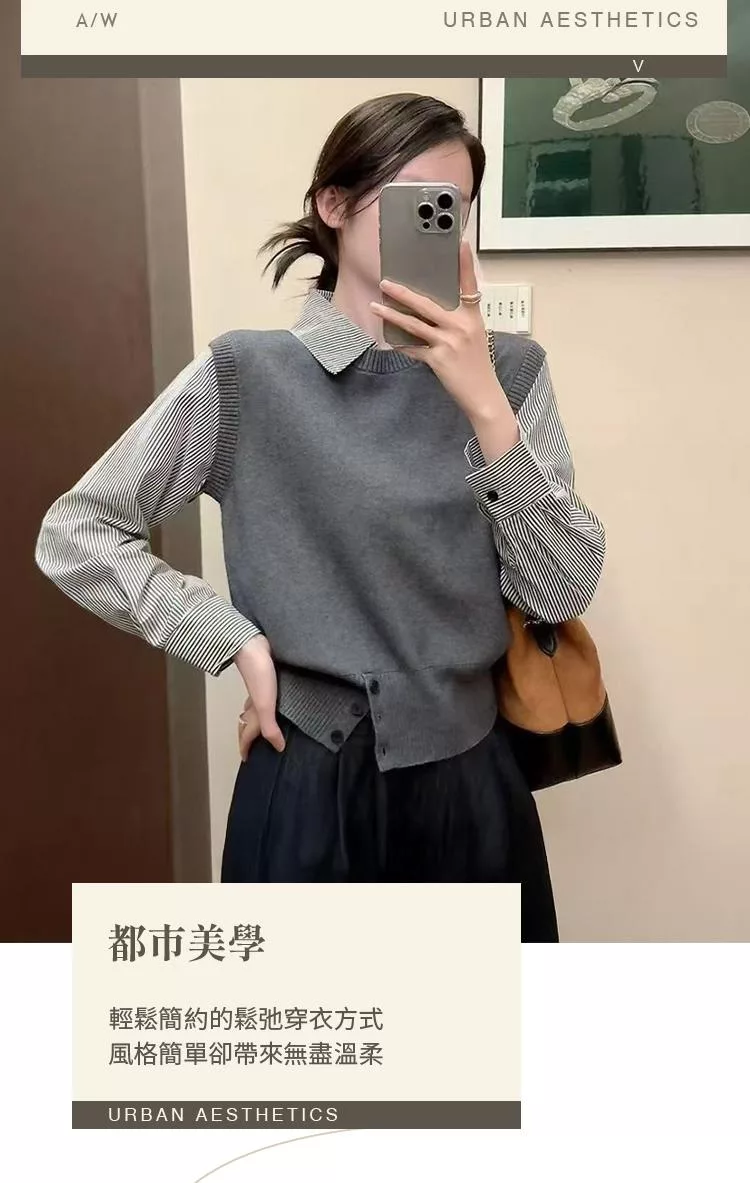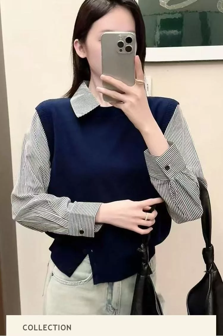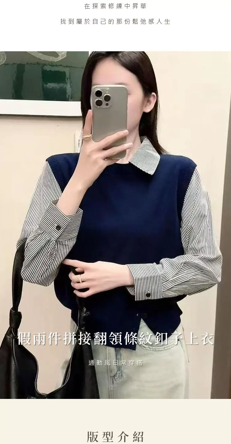 【初色】通勤風假兩件拼接翻領條紋釦子長袖襯衫上衣女上衣-共4色-16226(F可選) F 藏青色