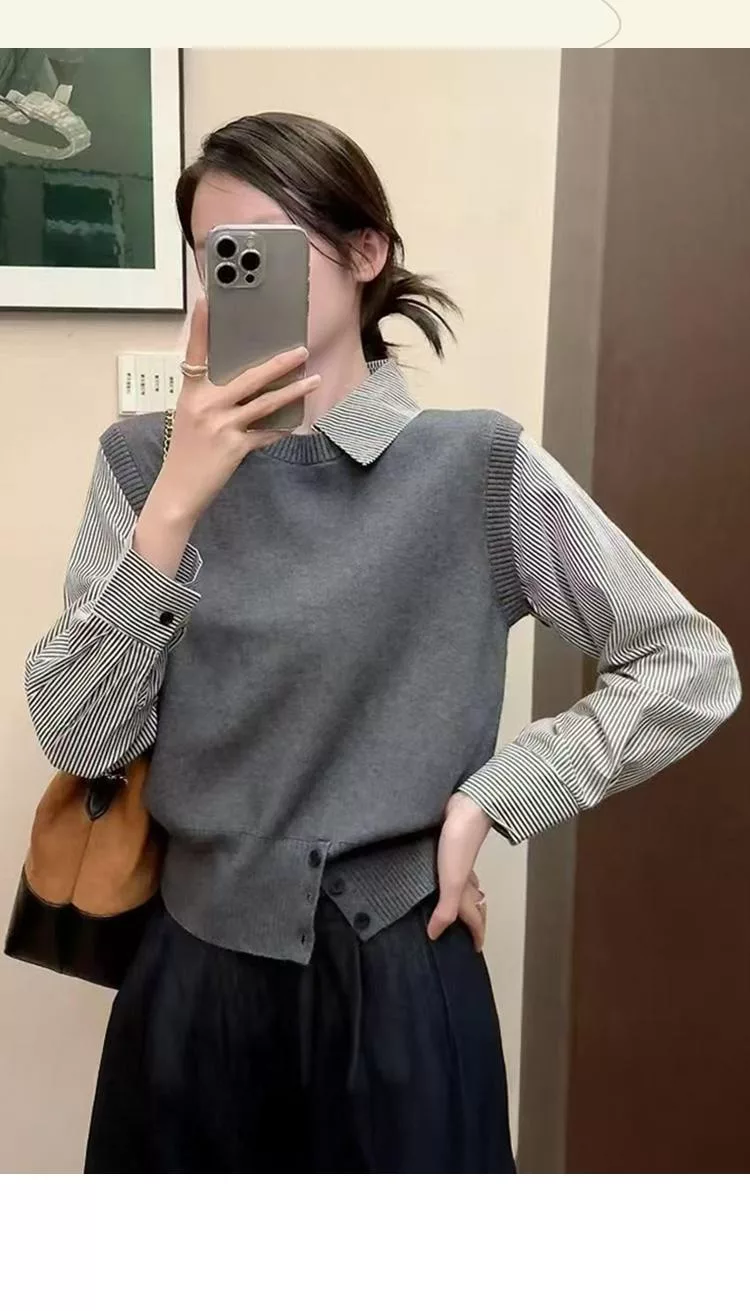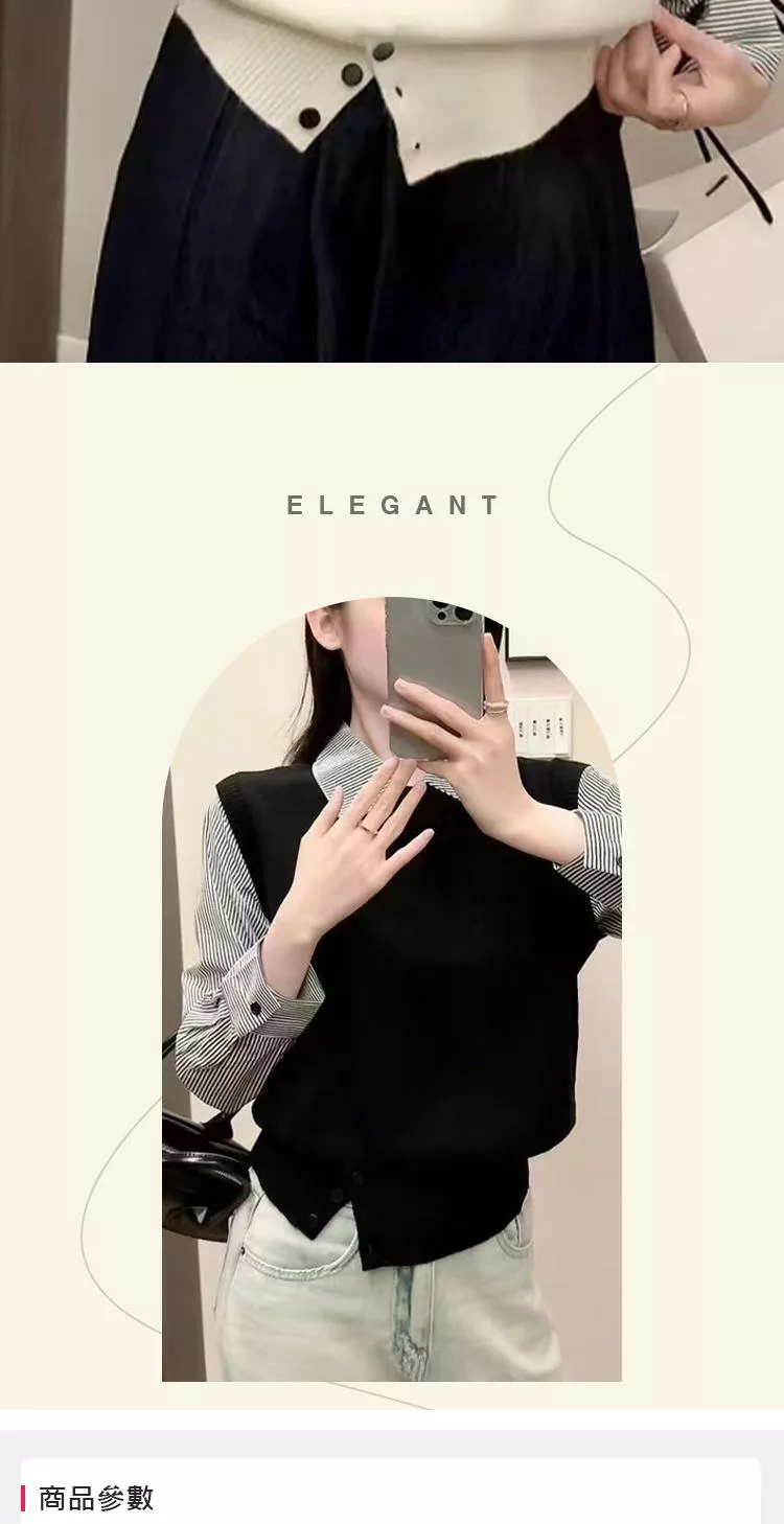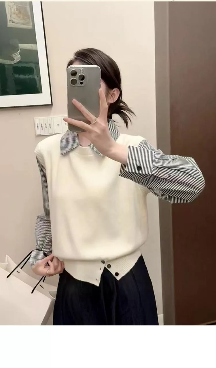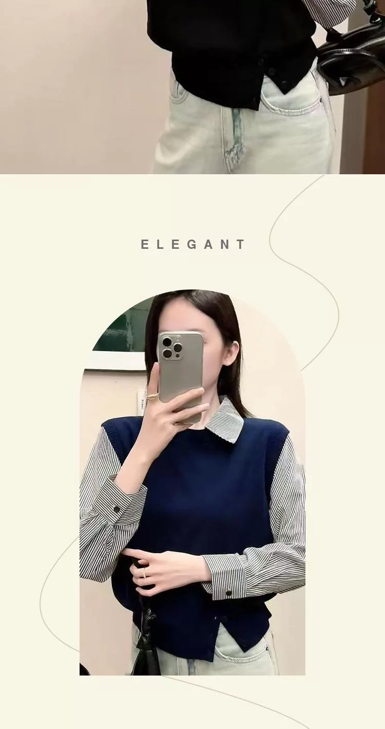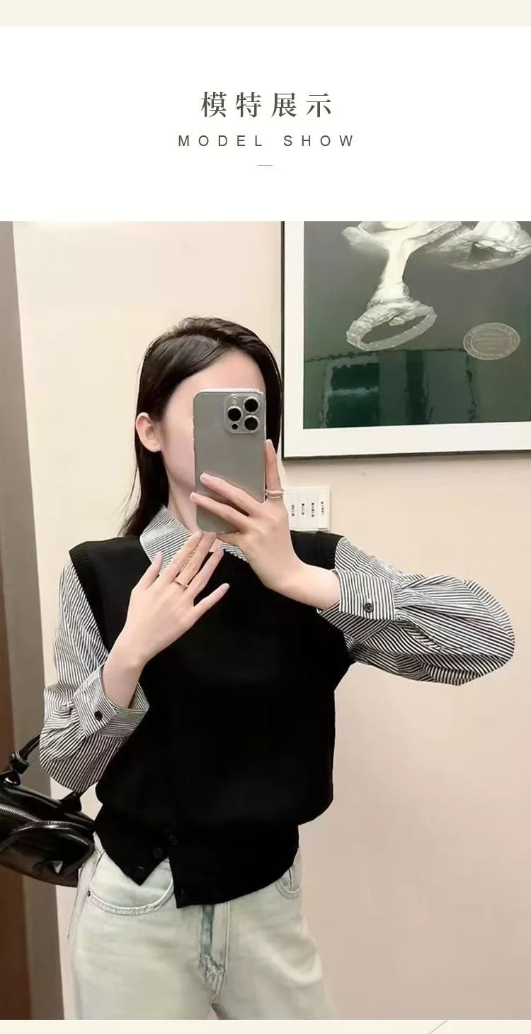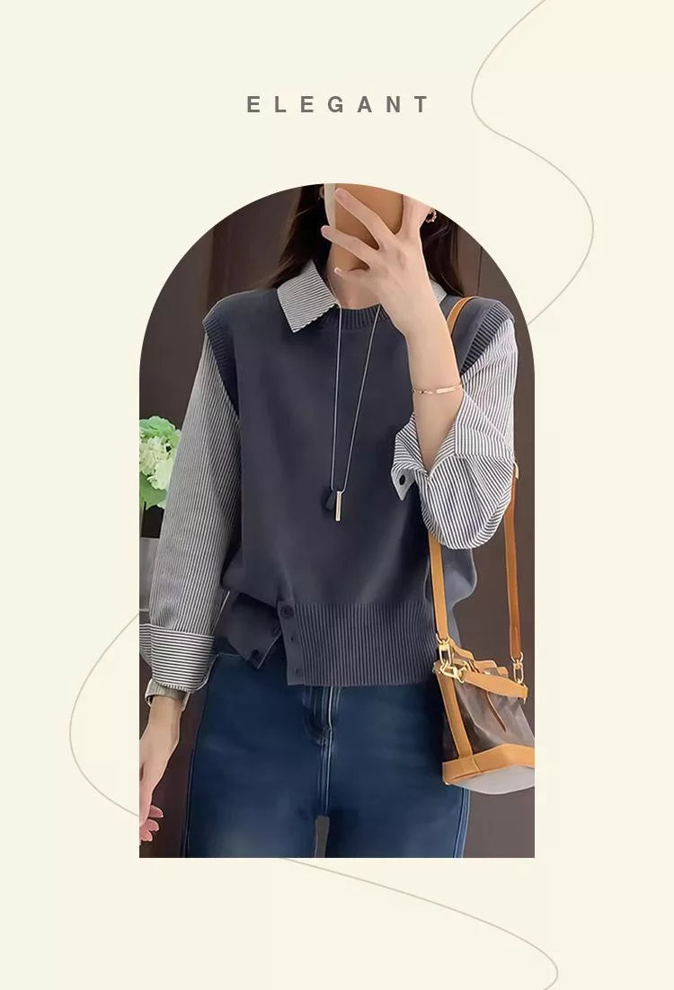 【初色】通勤風假兩件拼接翻領條紋釦子長袖襯衫上衣女上衣-共4色-16226(F可選) F 藏青色