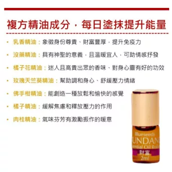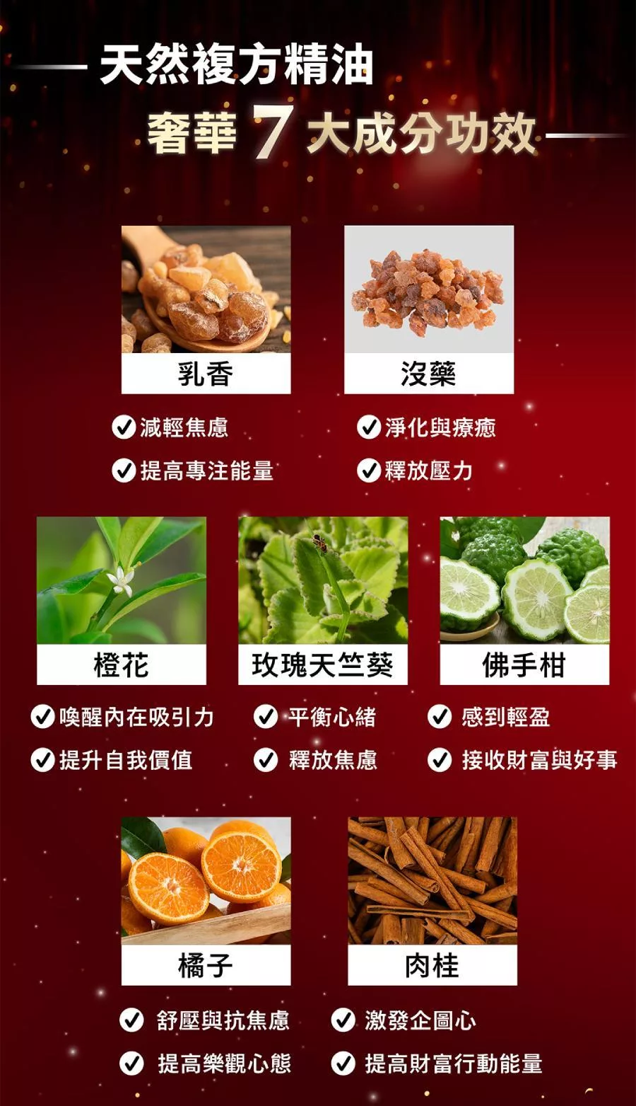 成分:乳香精油、沒藥精油、橘子花精油、玫瑰天竺葵精油、佛手柑精油、橘子精油、肉桂精油、甜杏仁油、小麥胚芽油