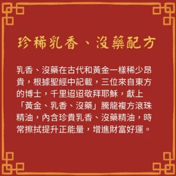 乳香、沒藥,意味著尊貴榮耀與珍貴價值,乳香在古代和黃金一樣珍貴,是極貴重的香膏,溫暖深沈的木質調香氣,代表神聖生命清香,行走之地留下香氣;沒藥則是古代作為藥材、祭祀及供品中使用,兩者皆有神聖意涵。