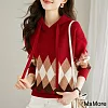 【MsMore】 本命年招財紅色時尚減齡菱形格長袖連帽短款針織衫上衣# 120521 FREE 紅色