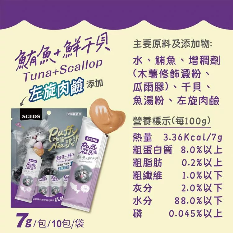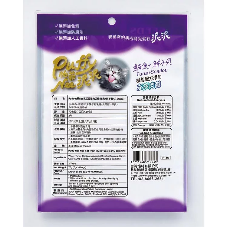 品名:Puffy帕菲Nee泥泥愛貓肉泥條(鮪魚+鮮干貝+左旋肉鹼)