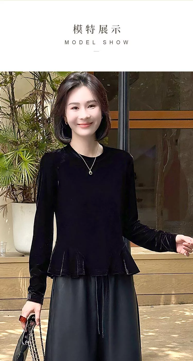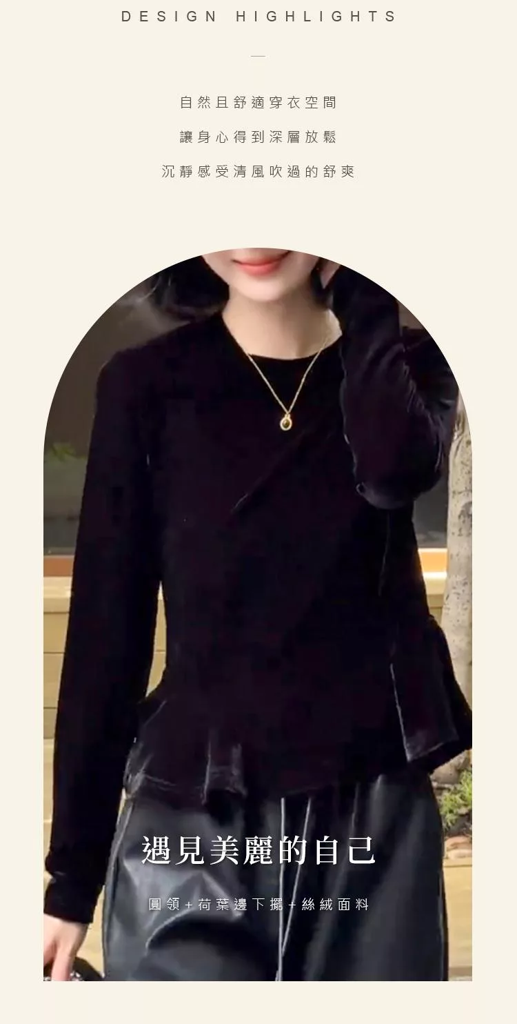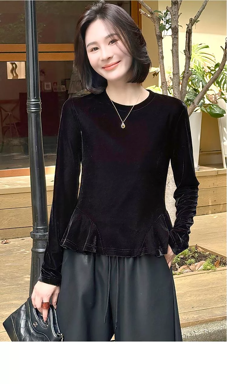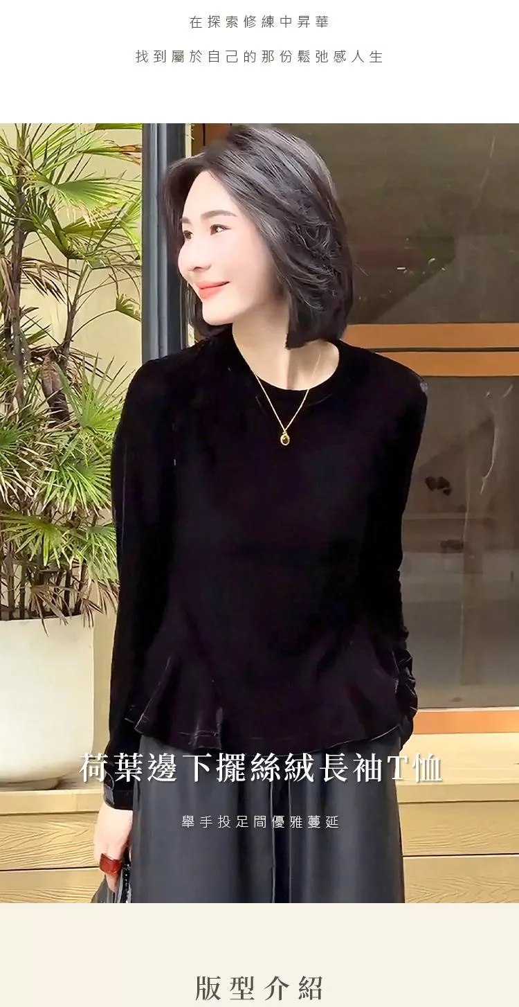【初色】簡約純色圓領荷葉邊下擺絲絨長袖T恤上衣女上衣-黑色-16487(M-2XL可選) M 黑色
