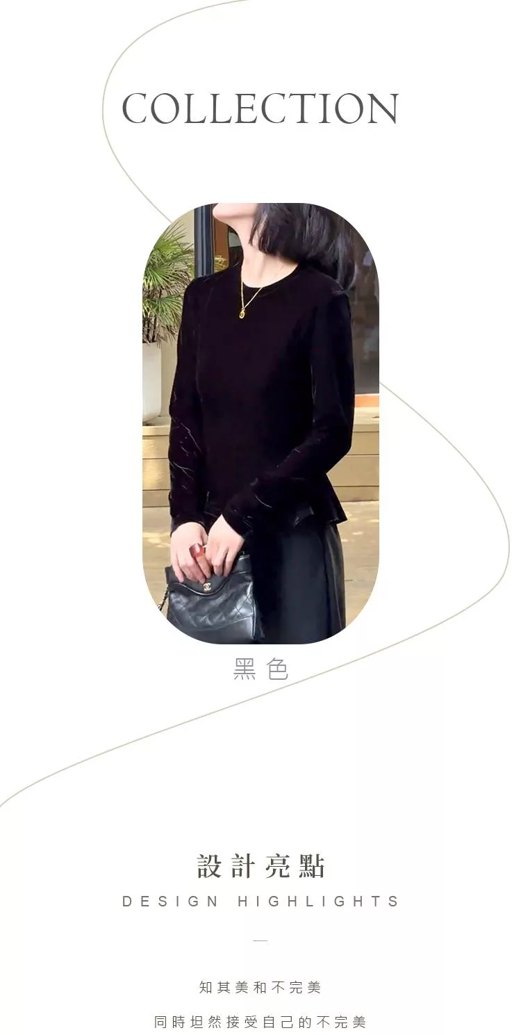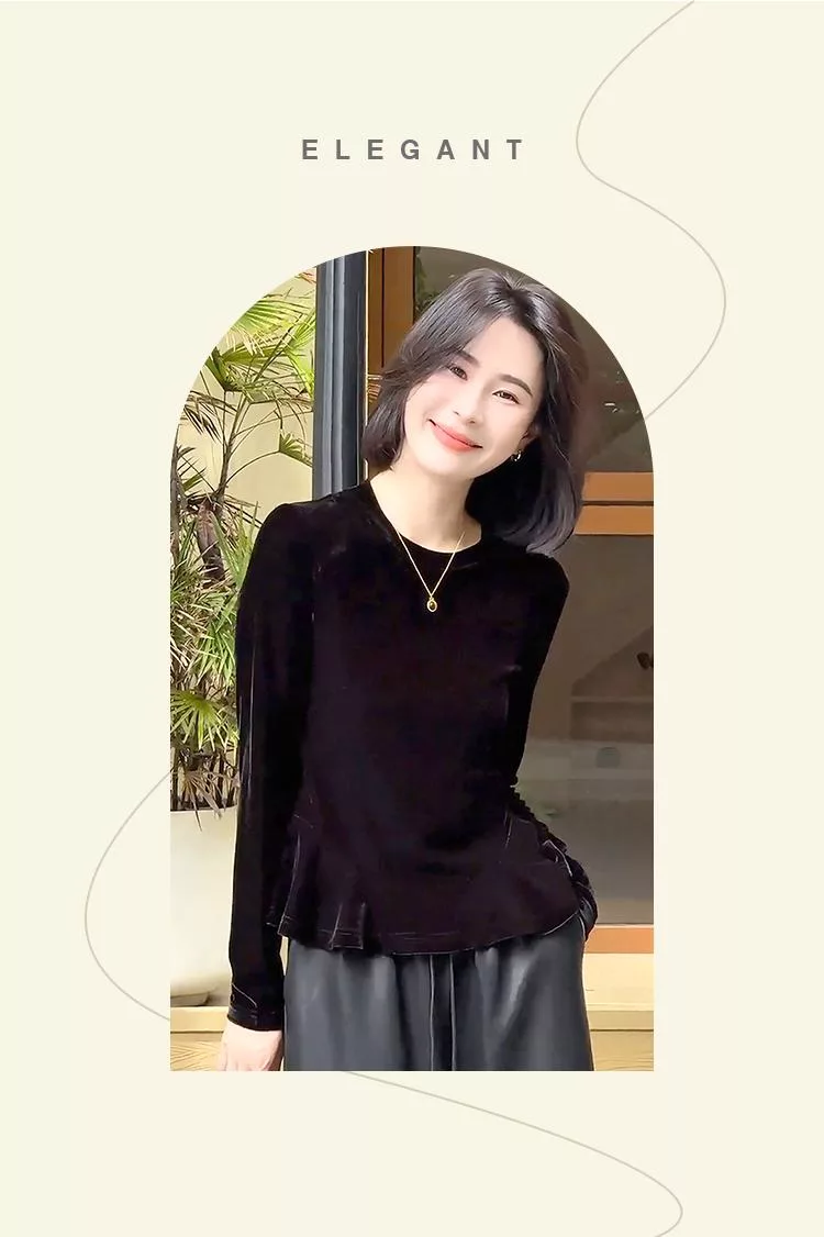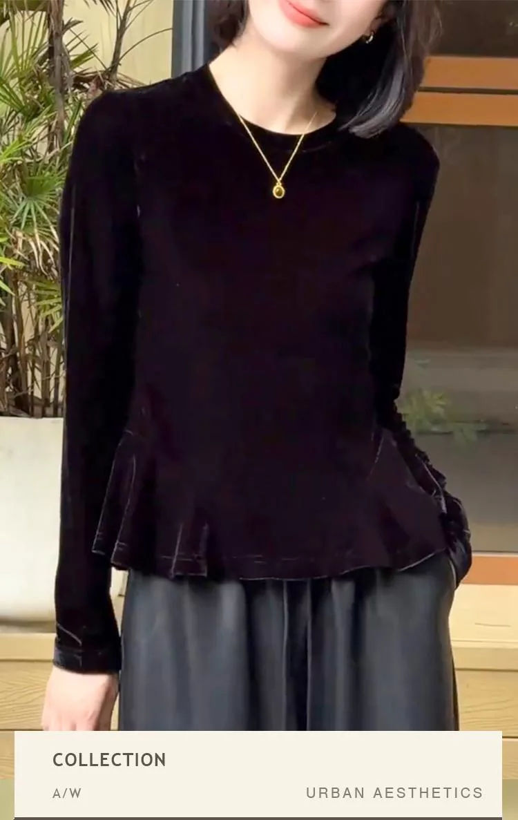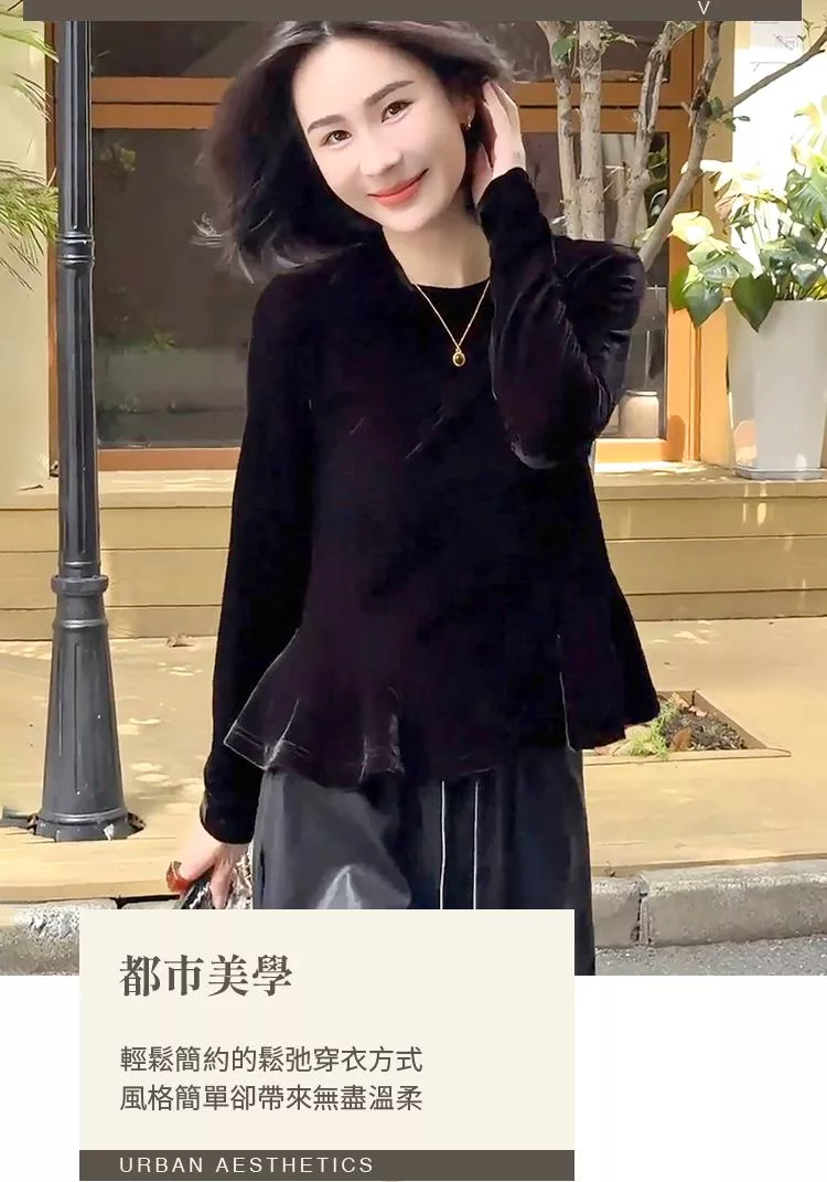 【初色】簡約純色圓領荷葉邊下擺絲絨長袖T恤上衣女上衣-黑色-16487(M-2XL可選) M 黑色