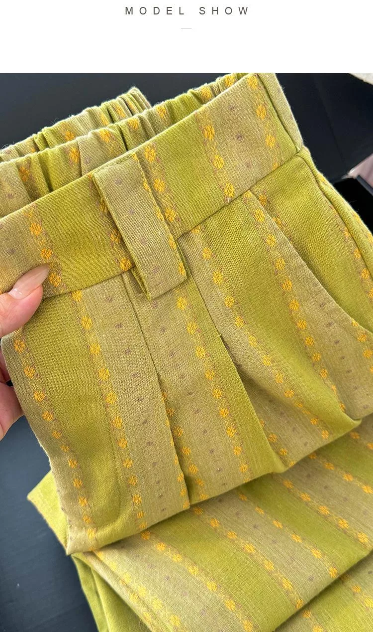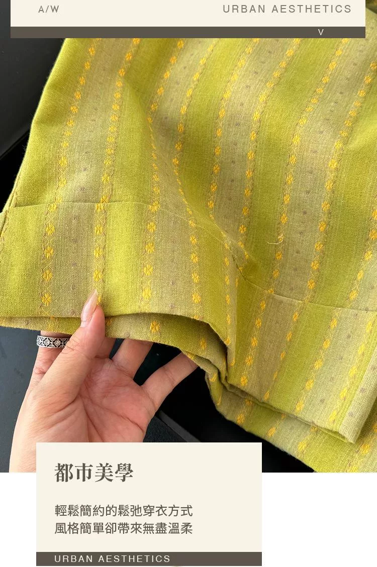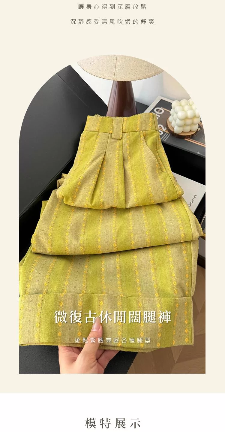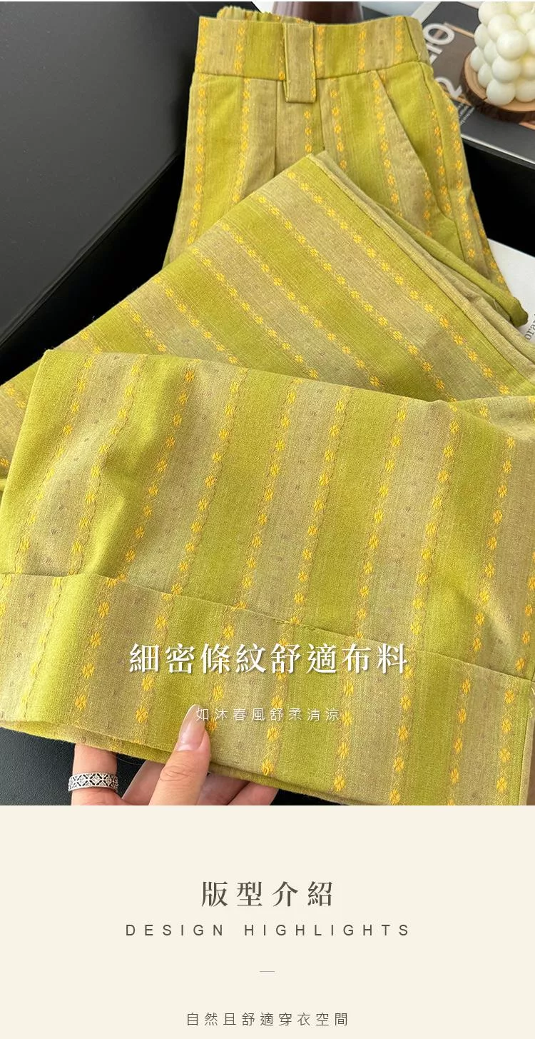 【初色】條紋簡約鬆緊腰寬鬆休閒褲寬褲闊腿褲棉麻風格長褲-黃綠色-16383(M-XL可選) M 黃綠色