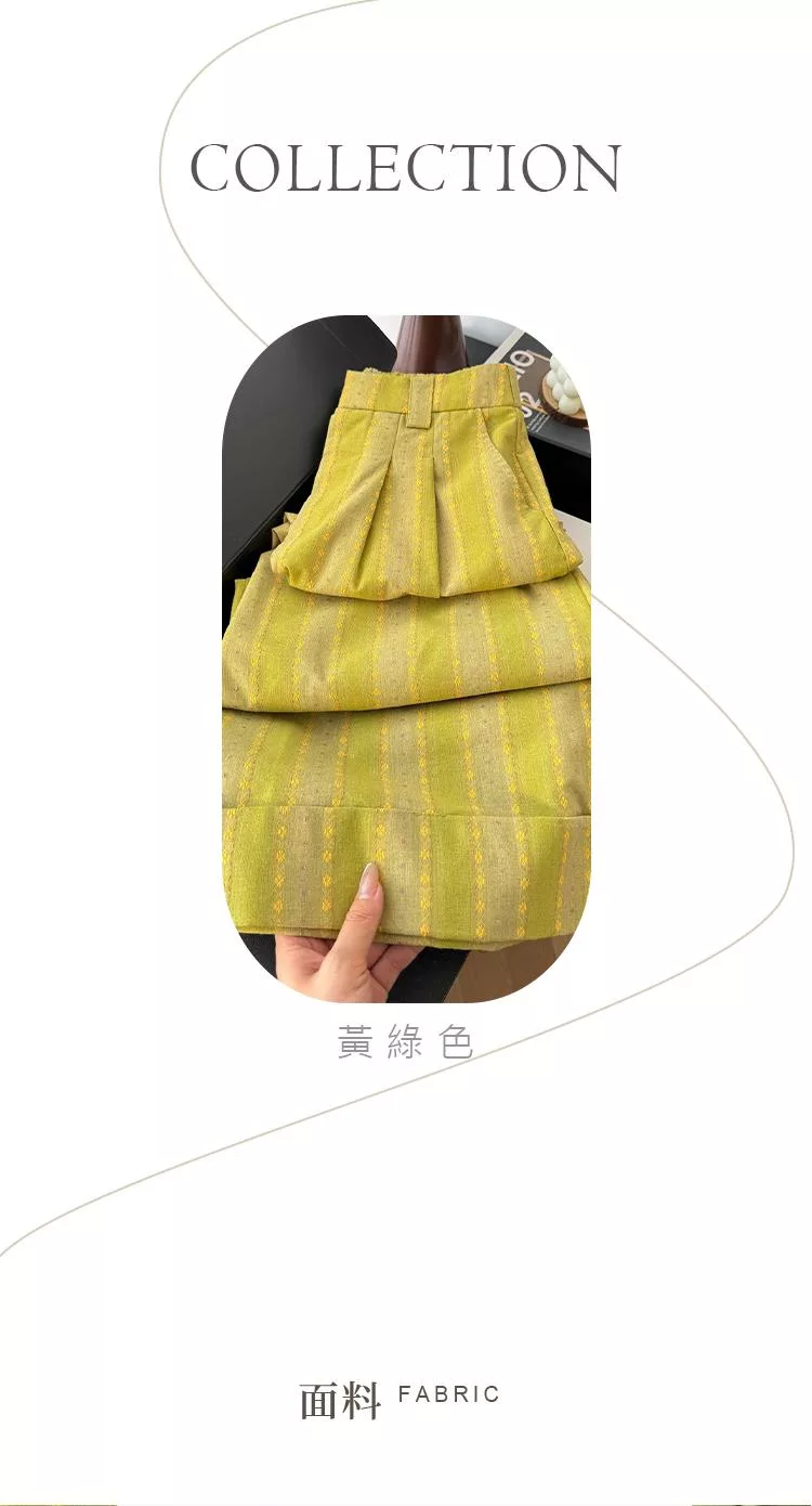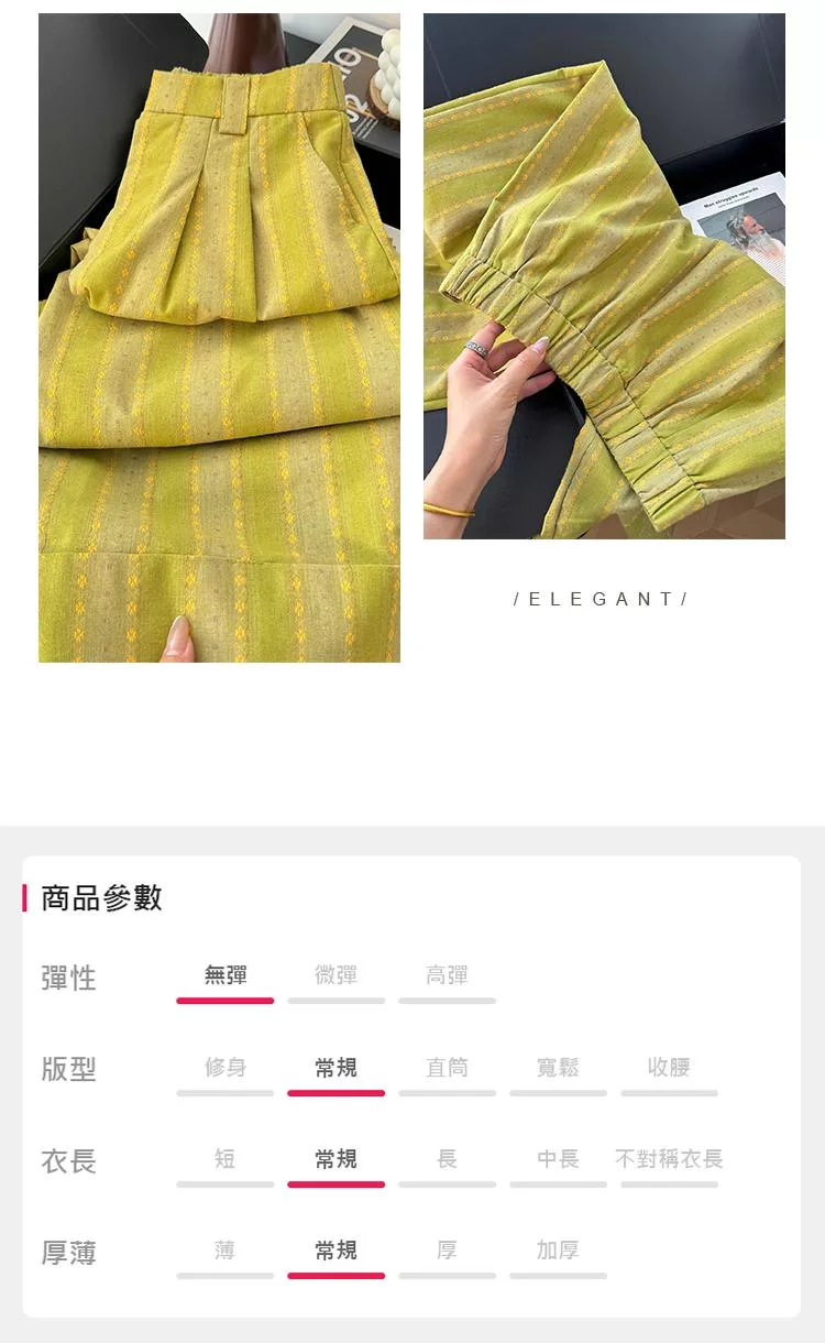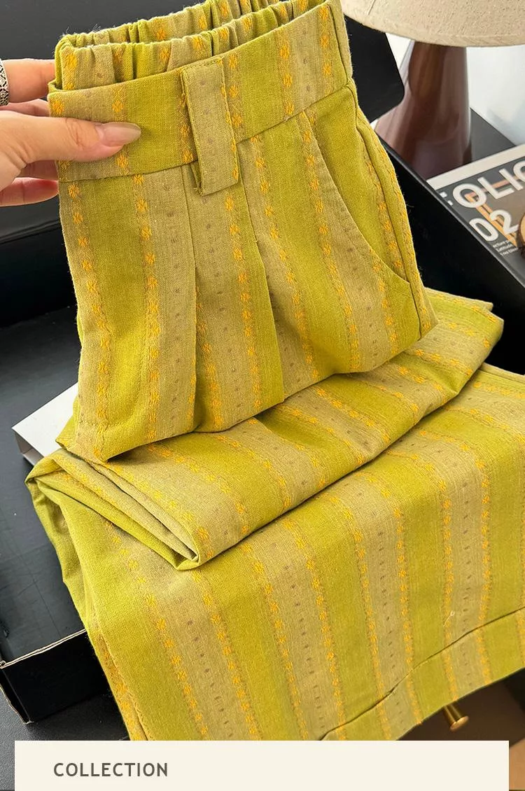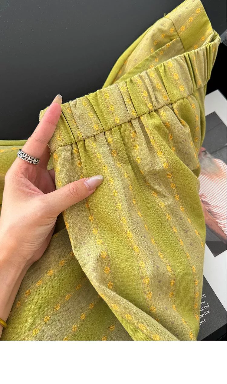 【初色】條紋簡約鬆緊腰寬鬆休閒褲寬褲闊腿褲棉麻風格長褲-黃綠色-16383(M-XL可選) M 黃綠色