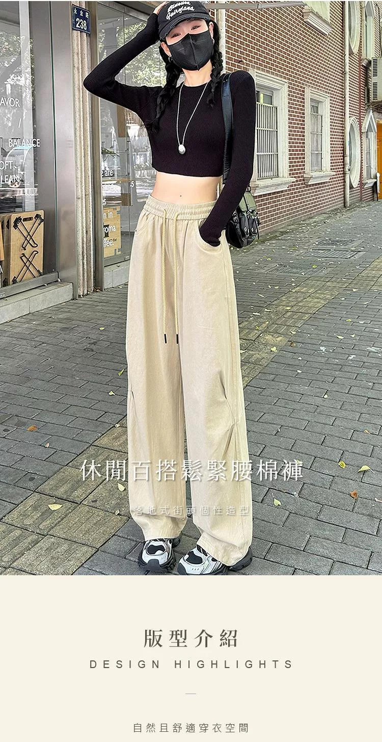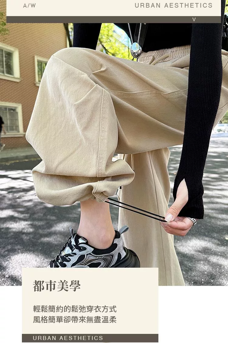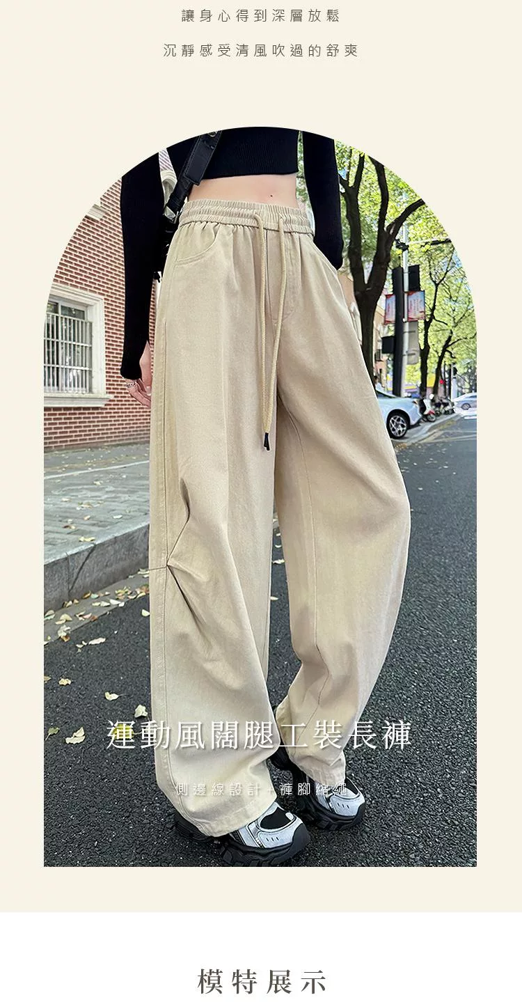 【初色】簡約休閒寬鬆運動風縮繩綁帶鬆緊腰闊腿工裝褲寬褲長褲-共3色-16672(M-2XL可選) M 淺卡色