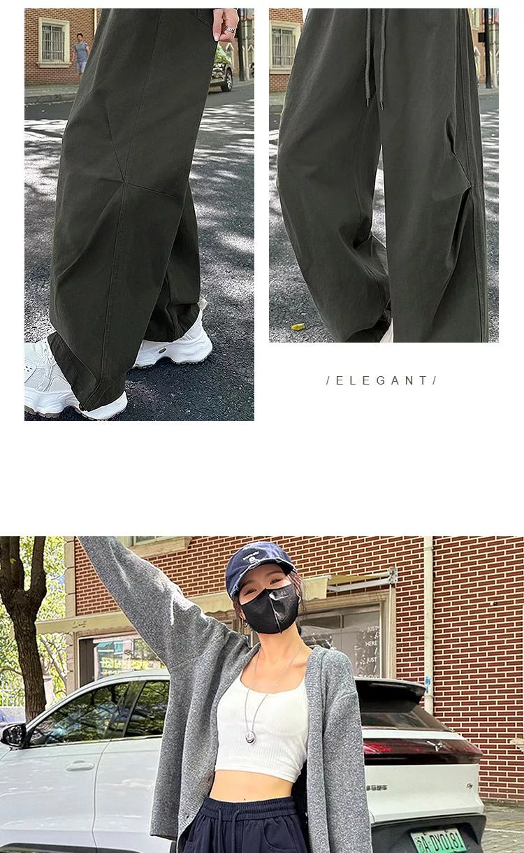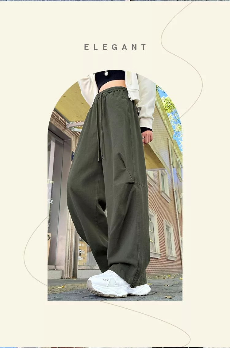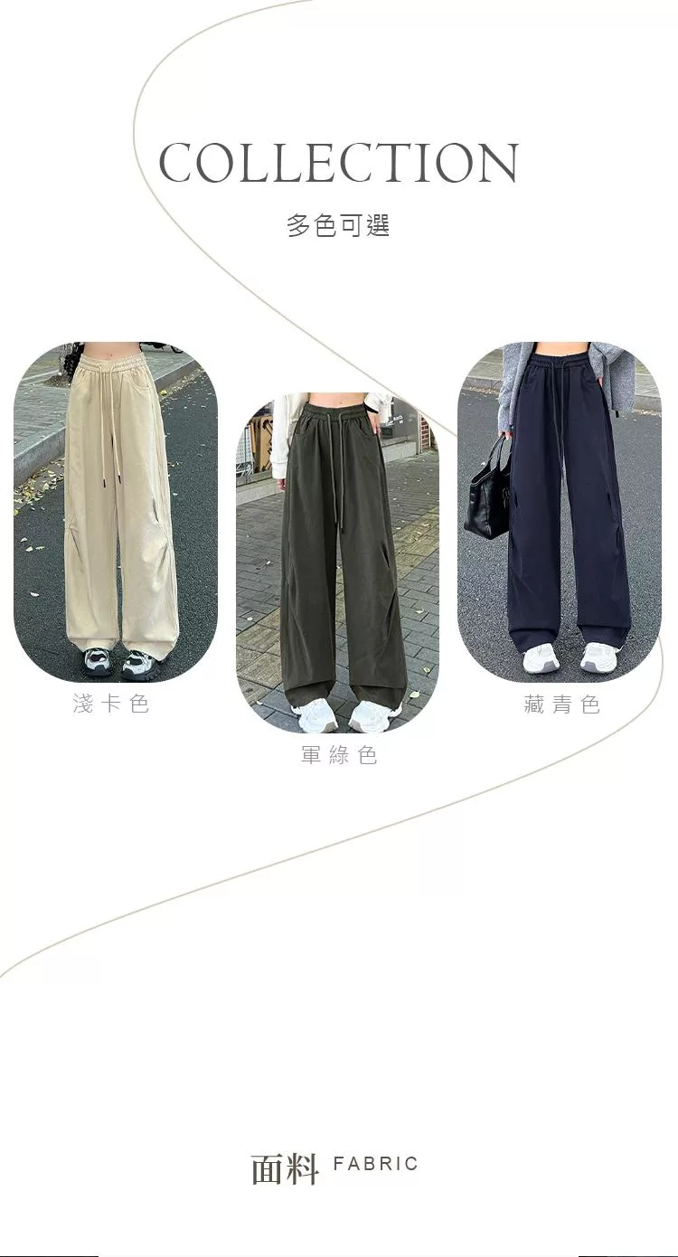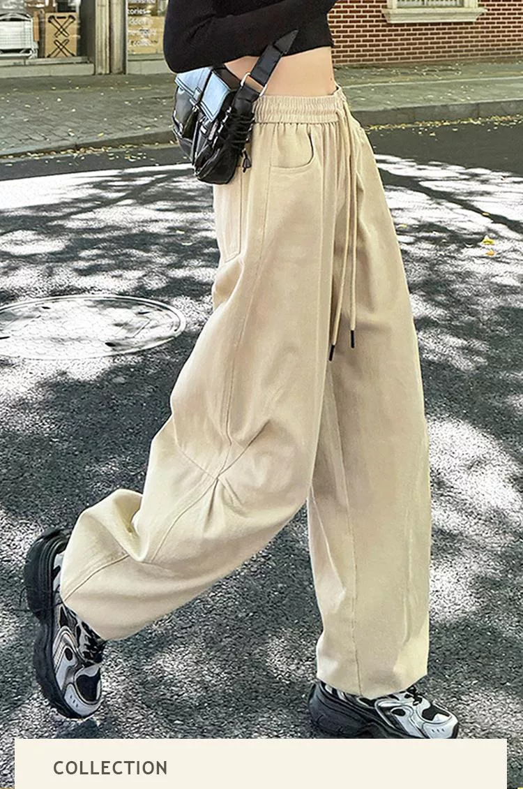 【初色】簡約休閒寬鬆運動風縮繩綁帶鬆緊腰闊腿工裝褲寬褲長褲-共3色-16672(M-2XL可選) M 淺卡色
