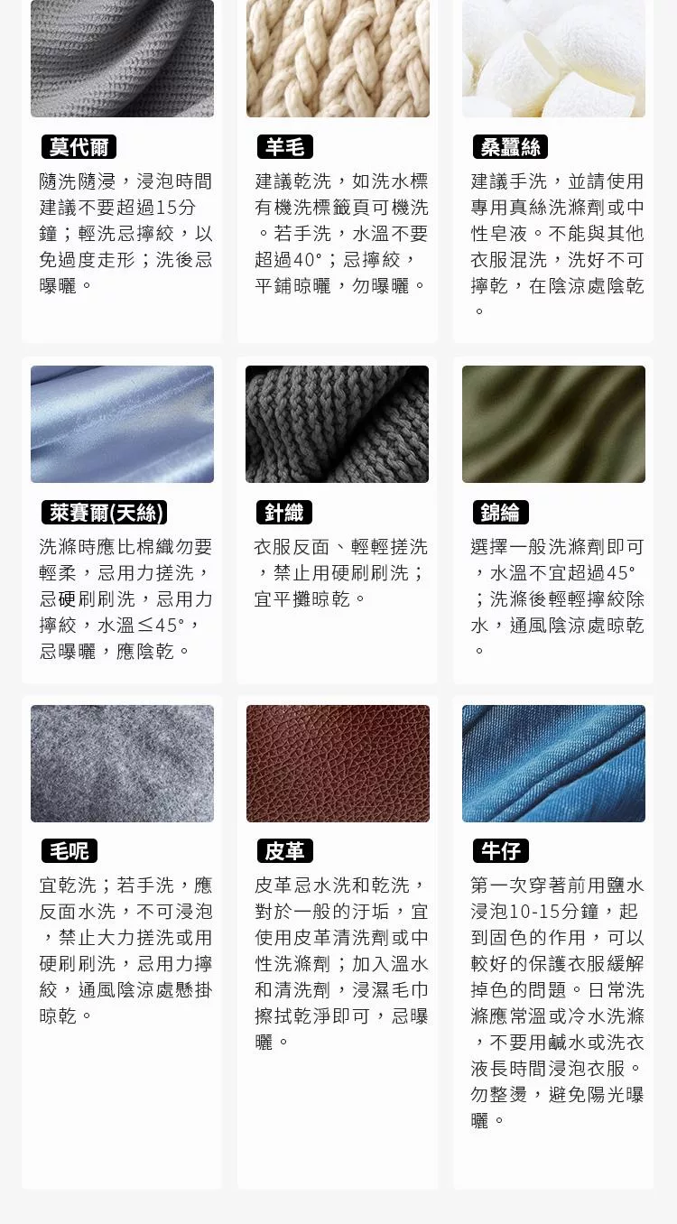 ●可水洗晾乾,不能使用冷洗精、柔軟精及漂白水,不能乾洗