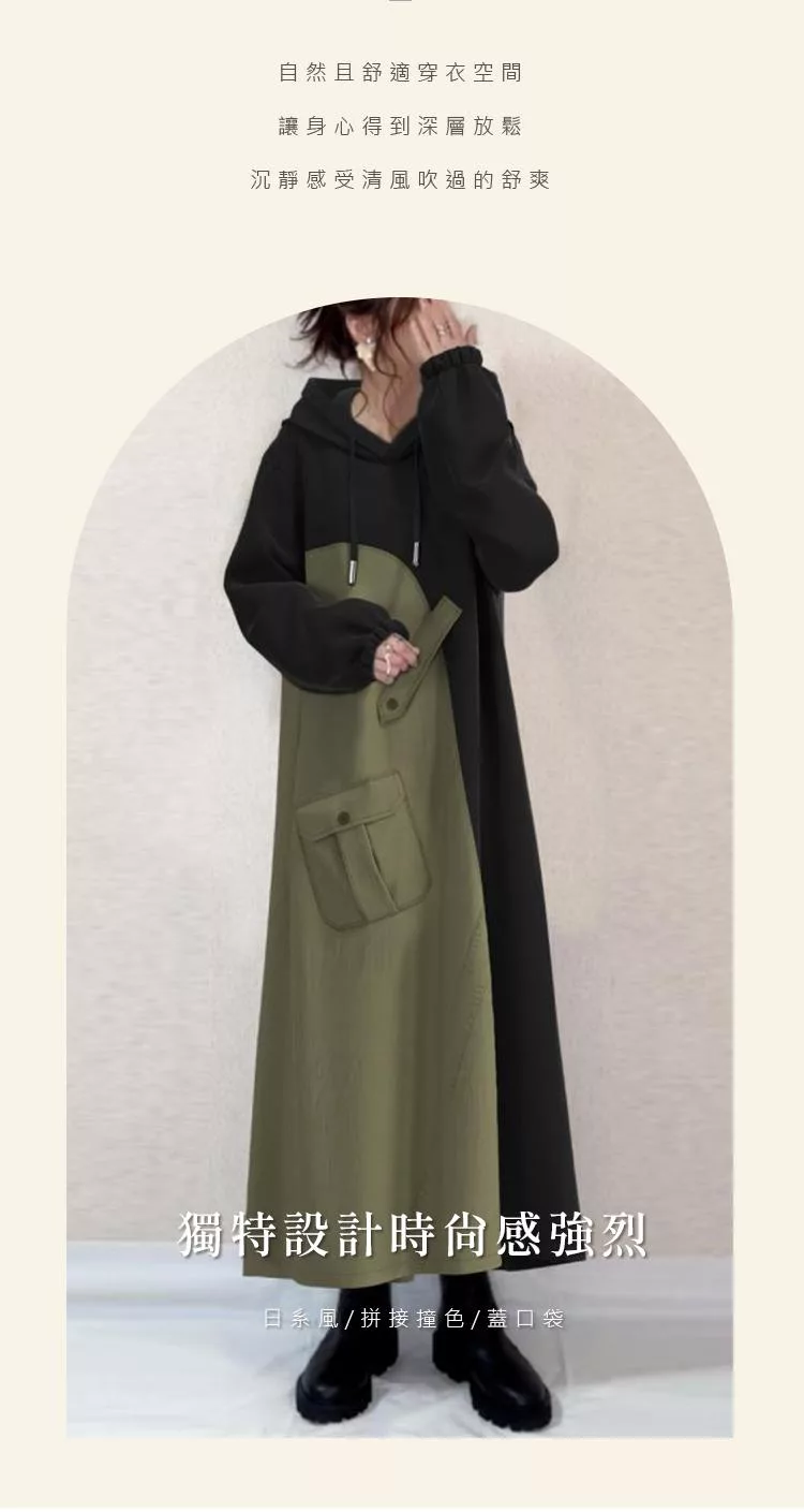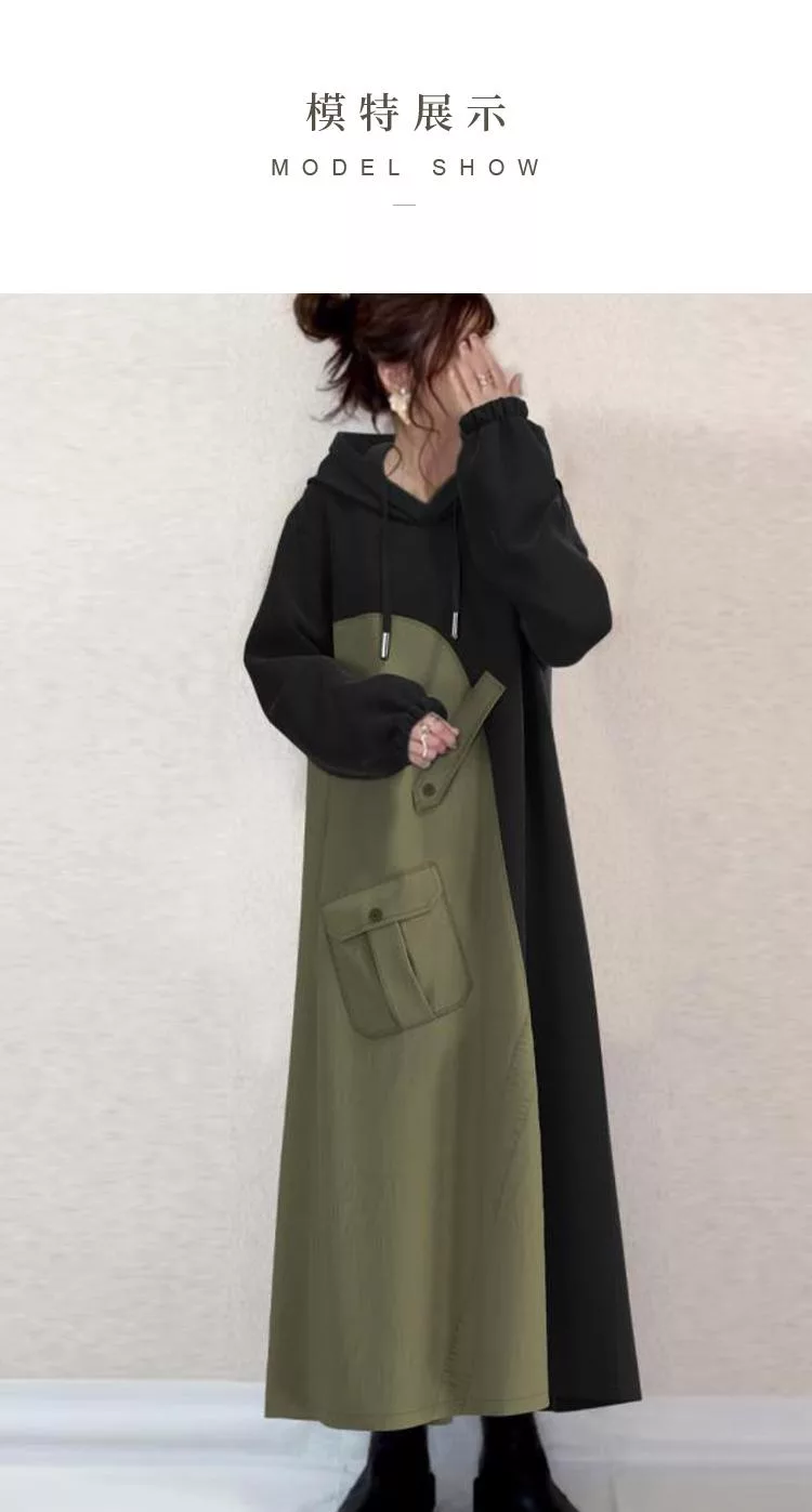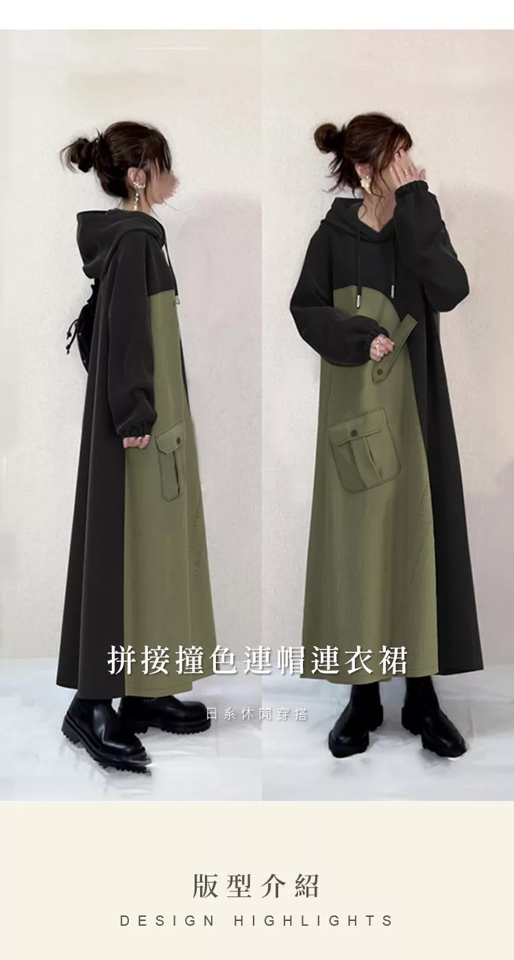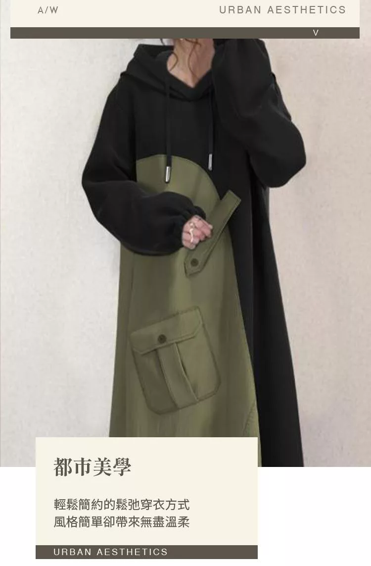 【初色】日系休閒寬鬆拼接撞色蓋口袋連帽抽繩長袖連帽中長裙連衣裙連身洋裝-黑色-39944(M/L可選) M 黑色